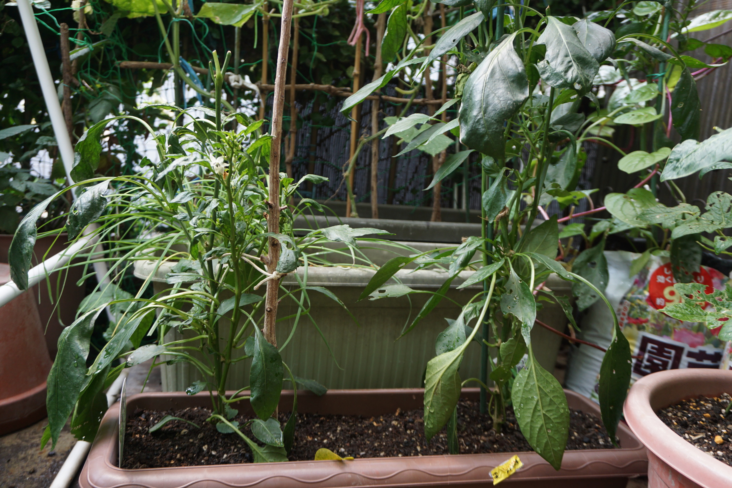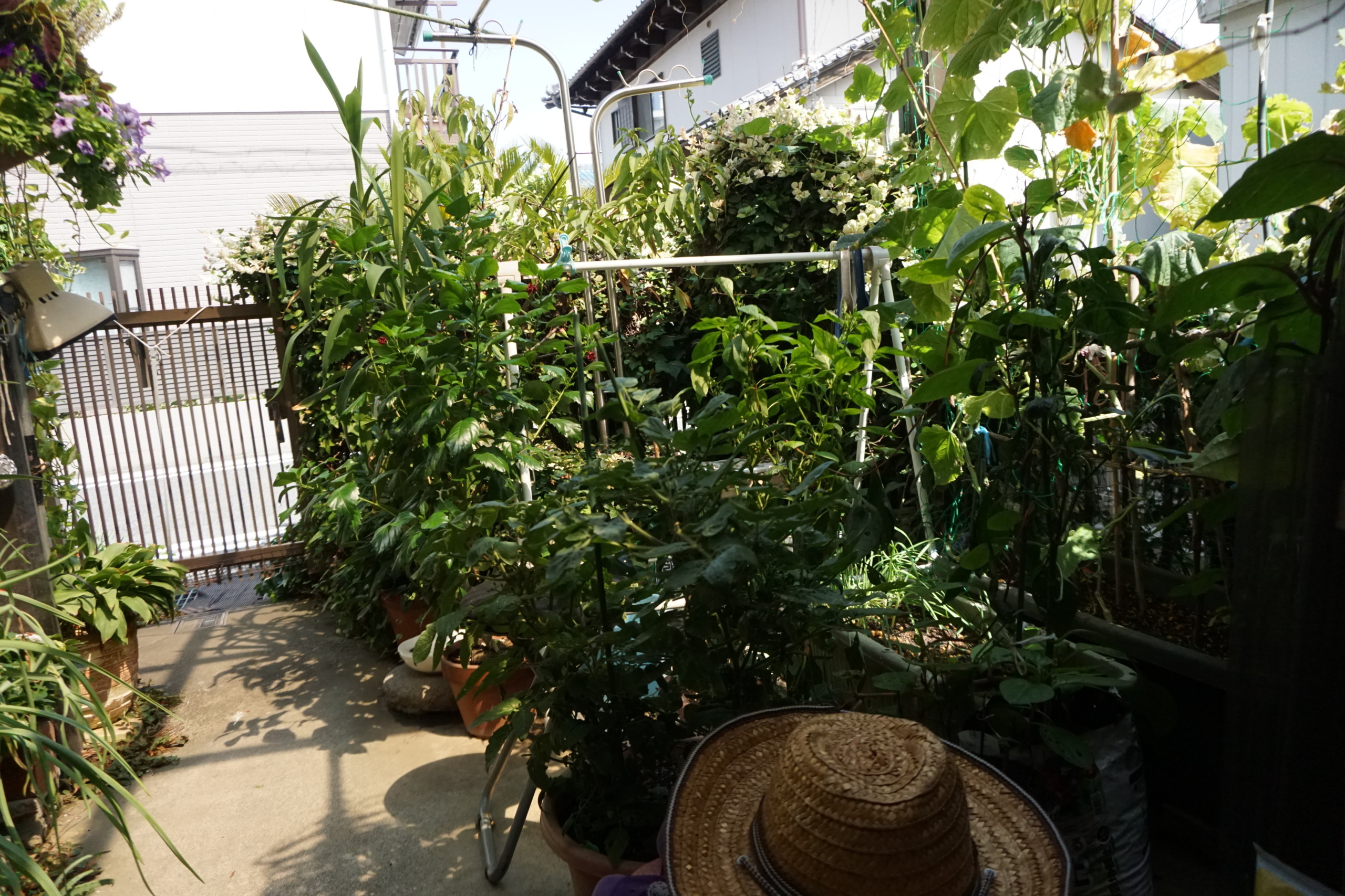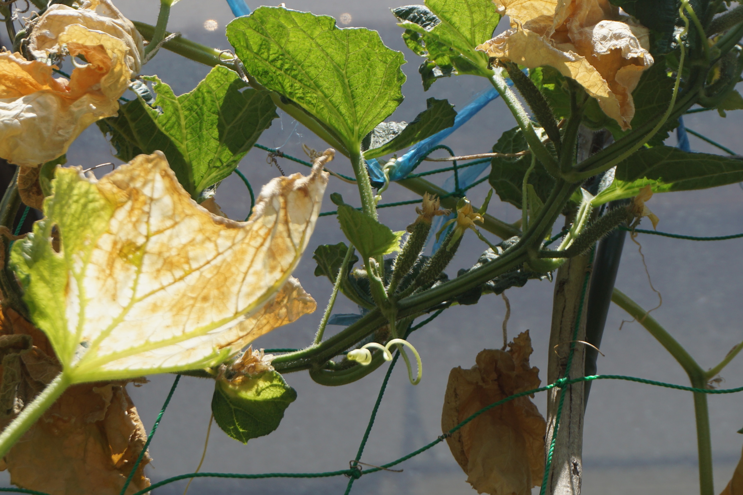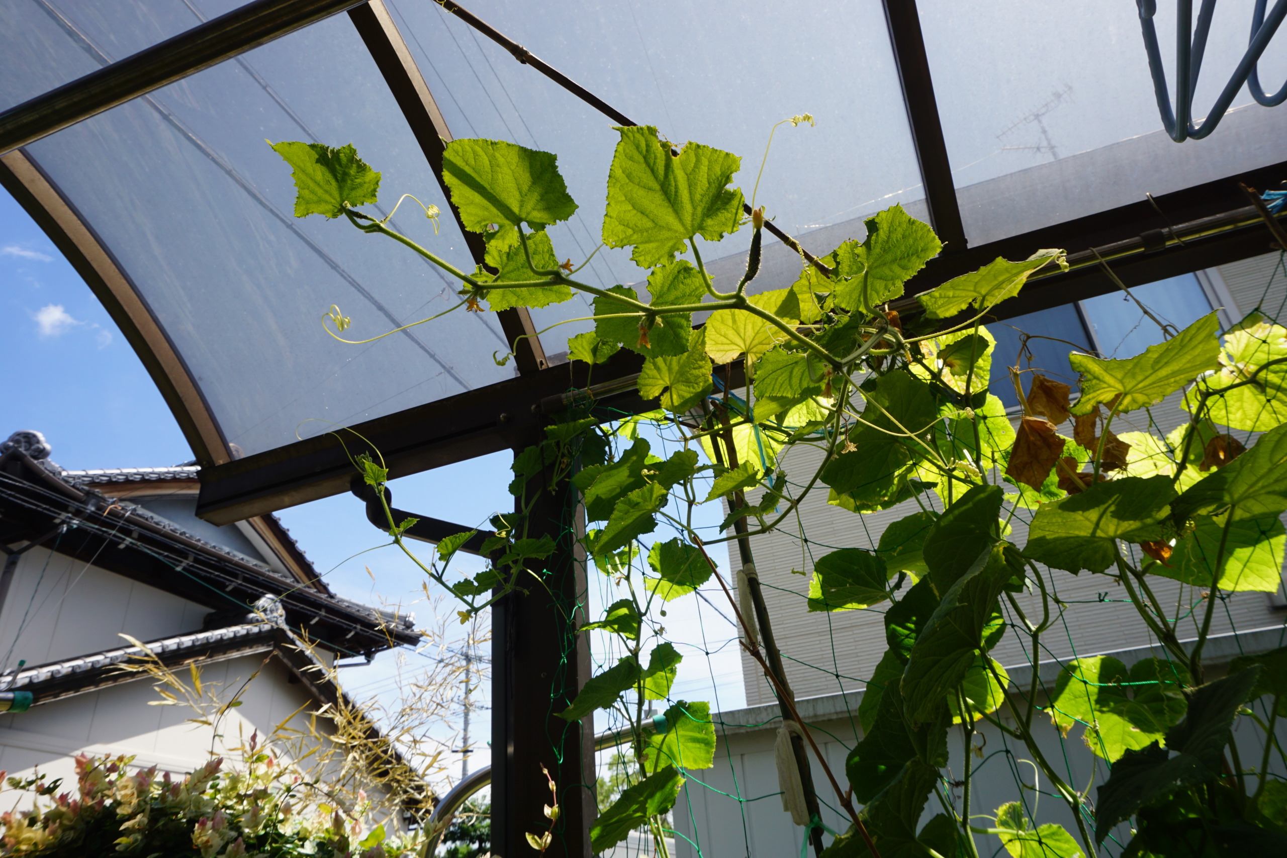 野菜も気温が高すぎると花がついても実にならないんだって。・・・野菜も熱中症みたいなもんか~?東から南から真上から日光直撃だからね。