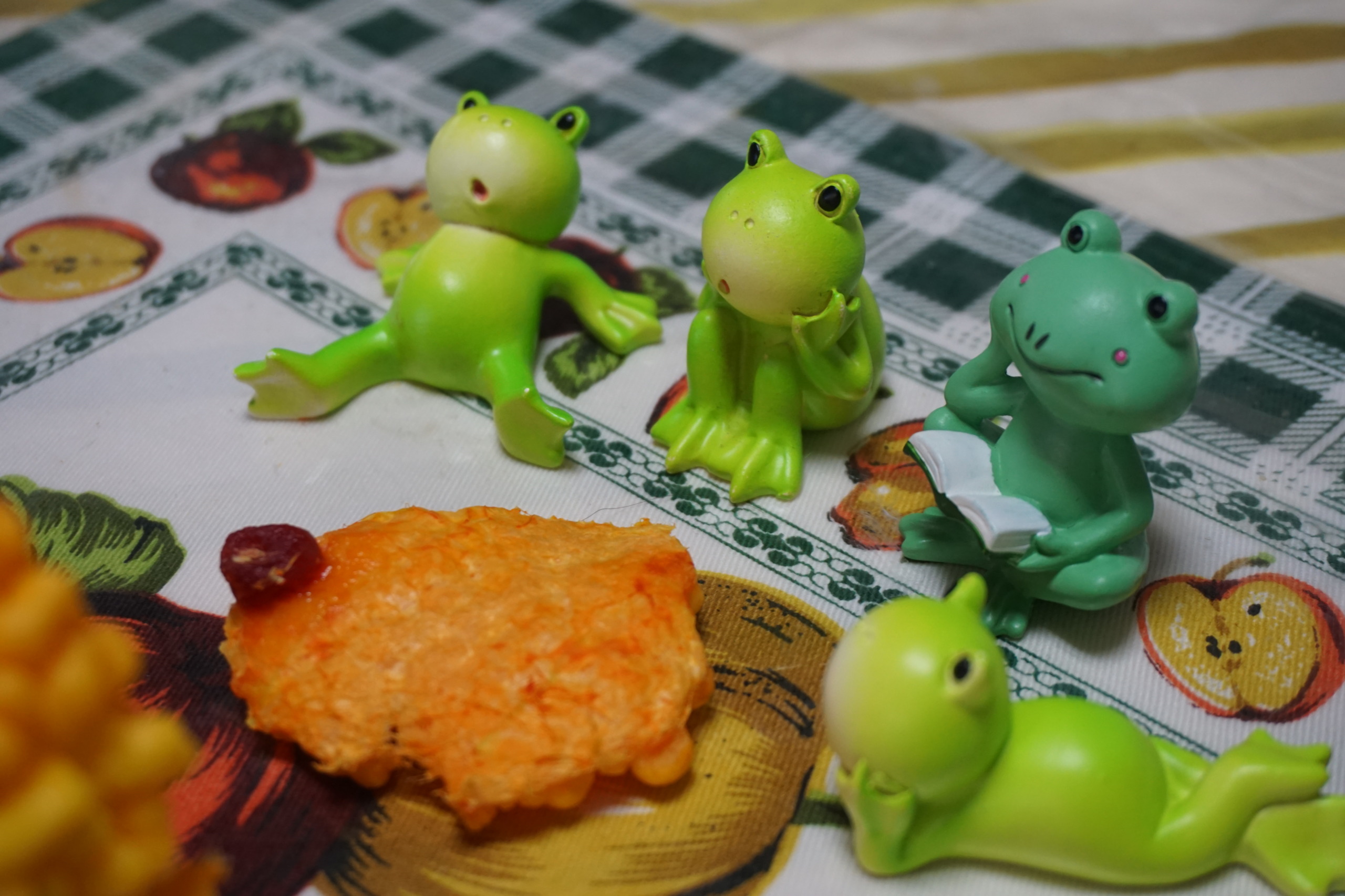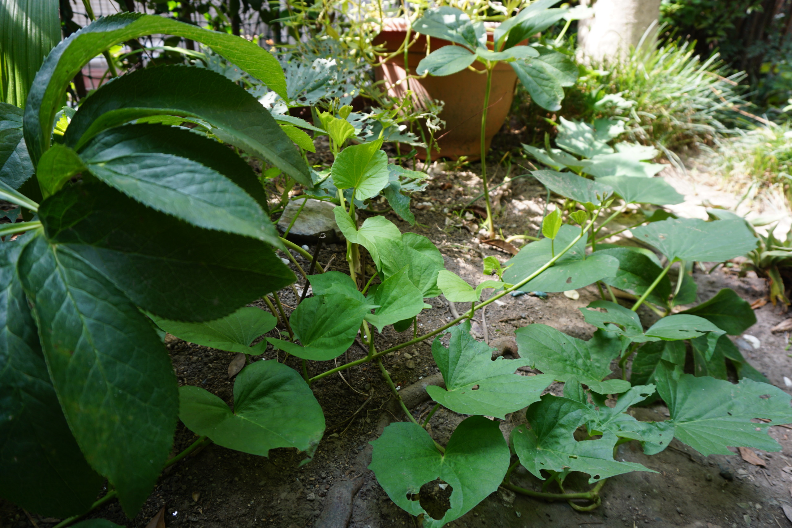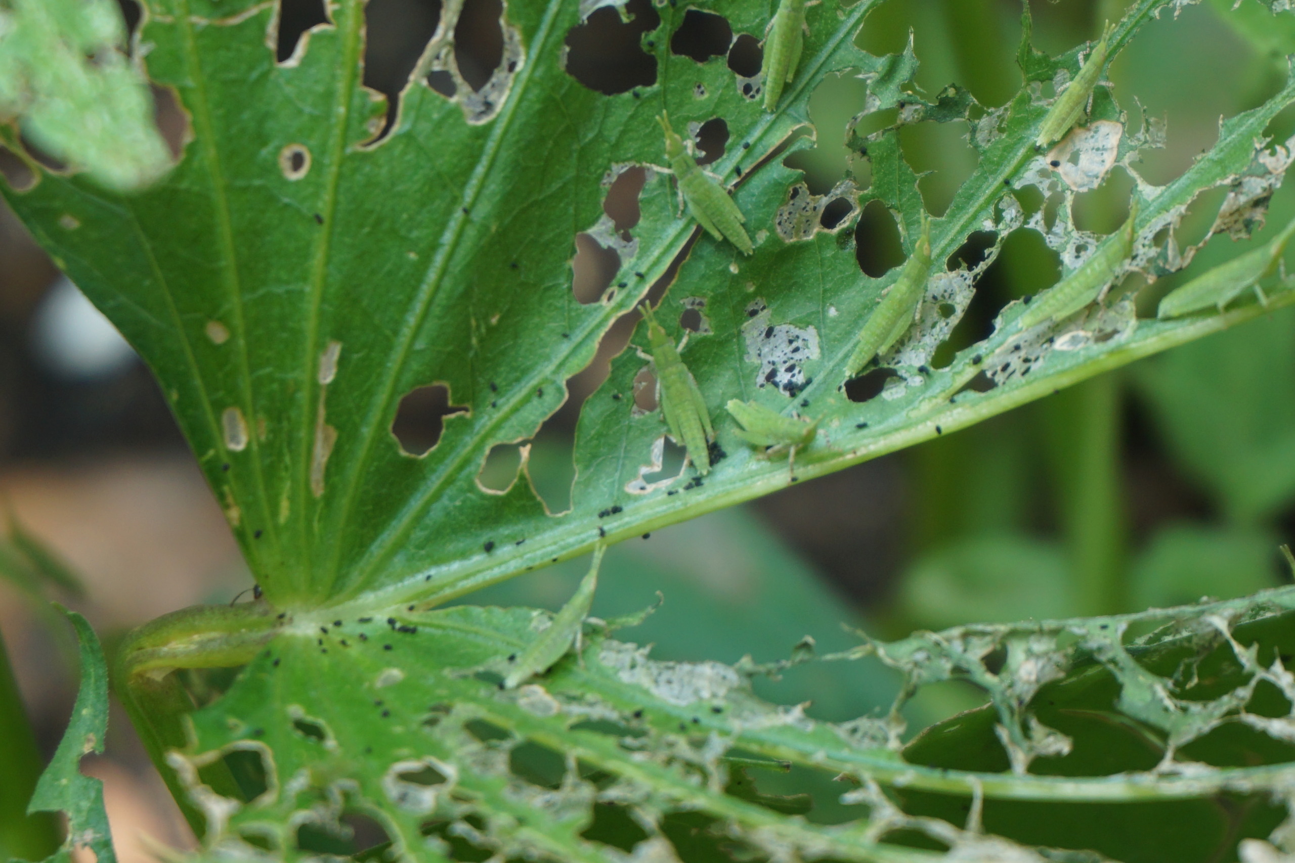 『サツマイモの葉っぱ、バッタのキッズ軍団の襲撃に合う。』