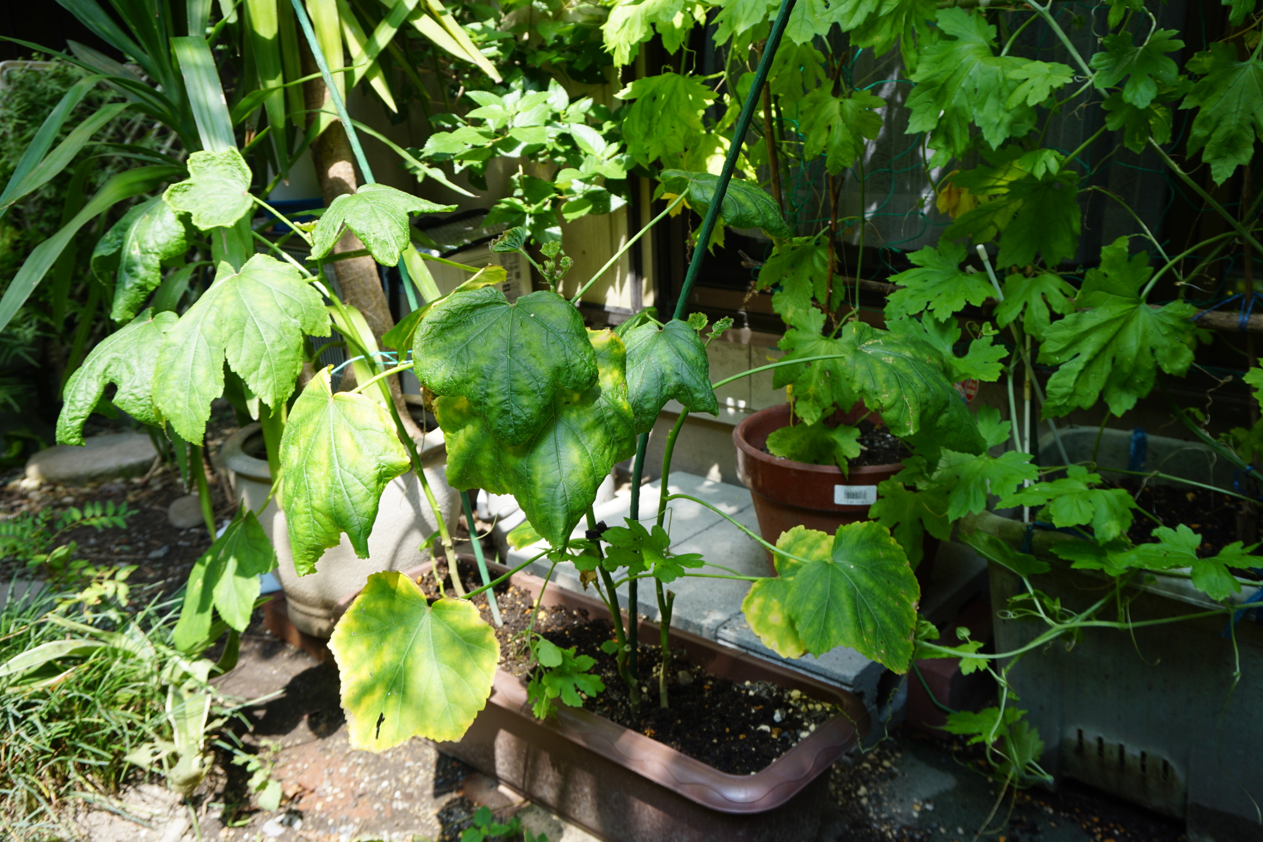 キュウリ君は残念なことにいつもなら遅くても8時には水やりにやって来るのに、やまんばなかなか出てこないんだ。10時にやっと出て来た時には土は乾きキュウリ君はうなだれていたんだ。慌てて水をあげたんだけど遅かった!猛暑の中を頑張って来たのにごめんよ。・・・