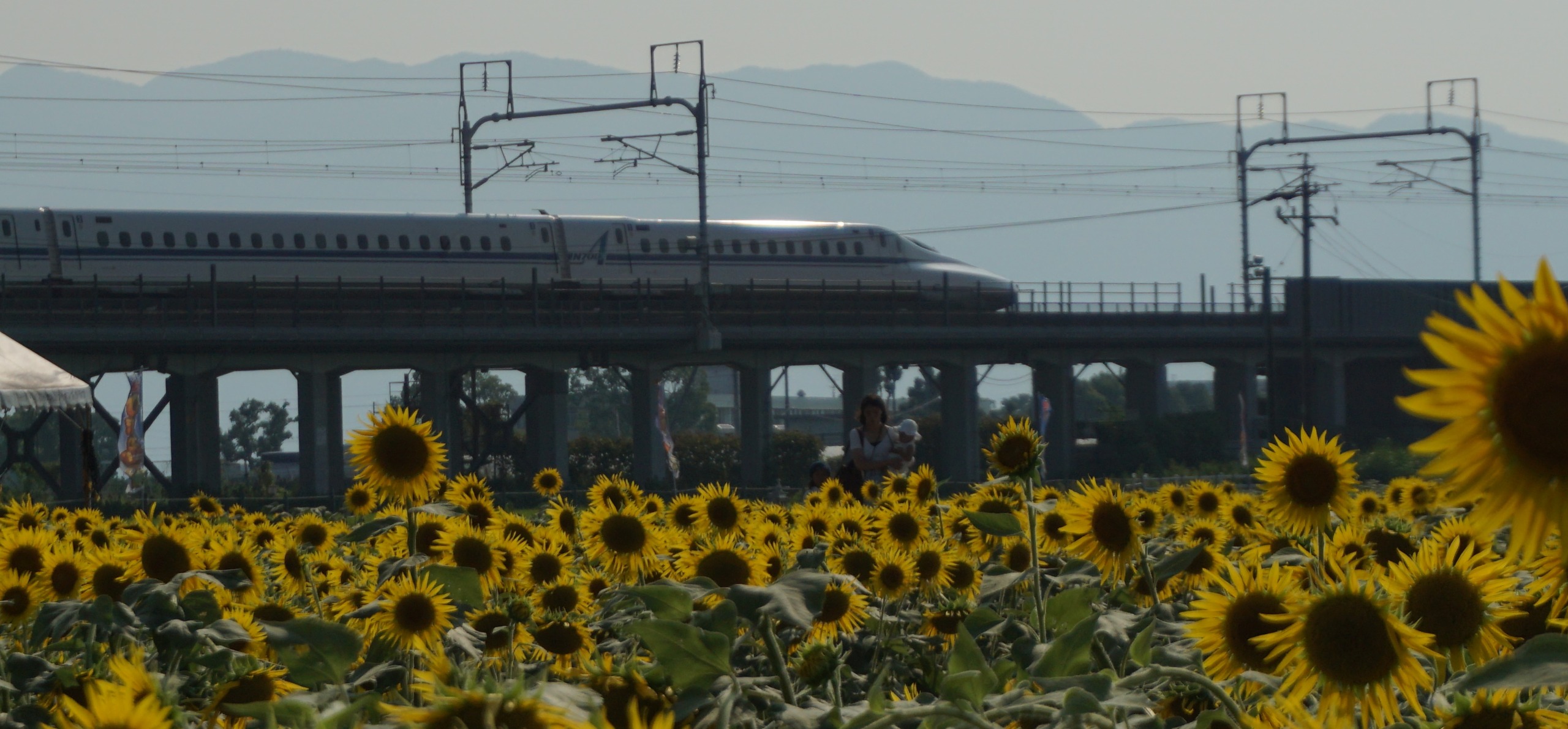 何とか人のまばらな畑の中に入り込みどういう風に撮ろうかと炎天下の中、思案・・・今年から畑の中で三脚は使用禁止となり、杖歩行のやまんばは両手でカメラを構え、片足で設定した構図を維持し続けるのはバランスがくずれ無理だったんだ。・・・・ そこにもって 大変‼ ファインダーには帽子をかぶったやまんばの顔が映り、カメラの向こうの風景がさっぱりわからないんだ。『なんてこったー‼』・・・・ 新幹線が通るたび、おおじさんが帽子の上にタオルを掛けてくれ、なんとか撮れたんだって。・・・・