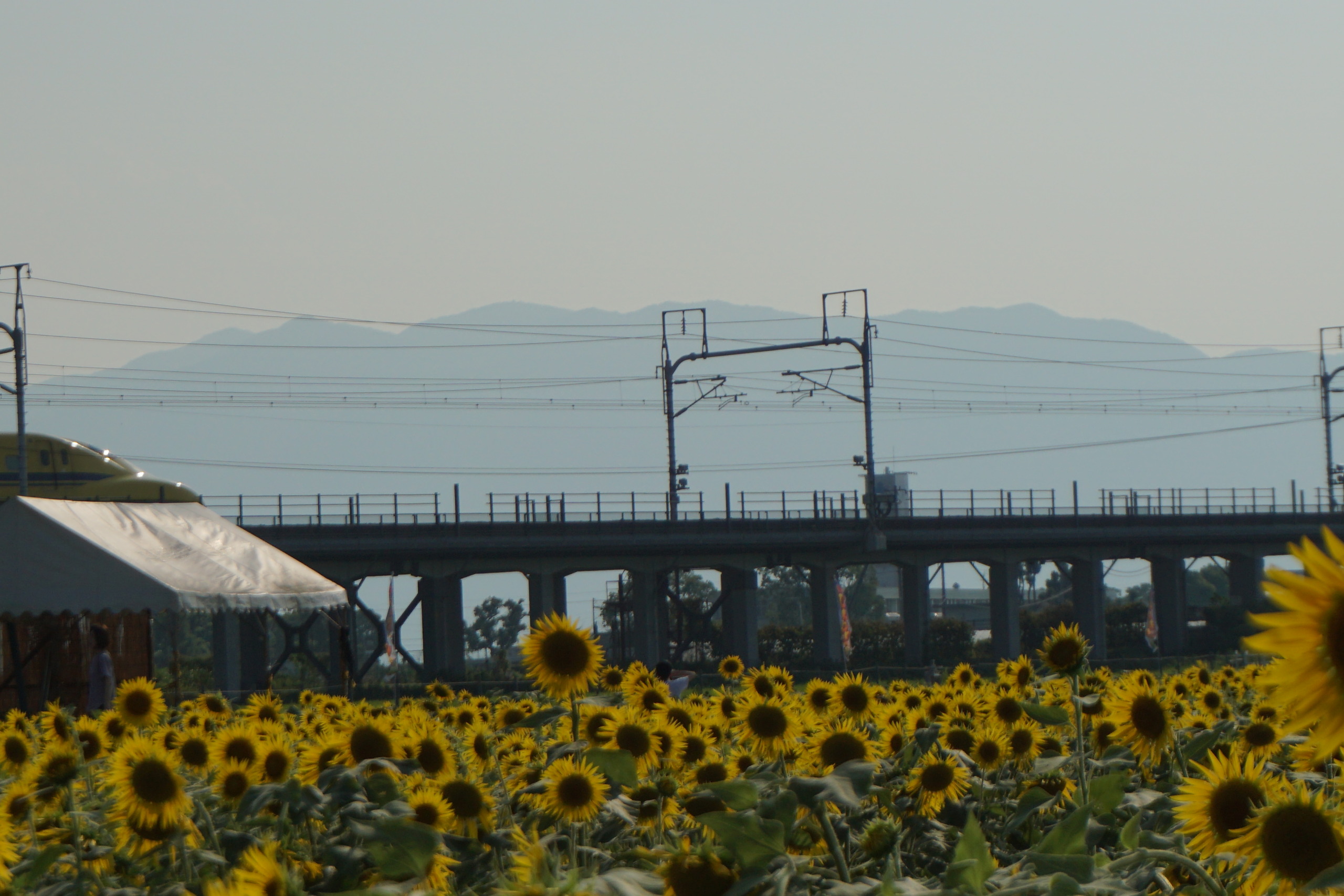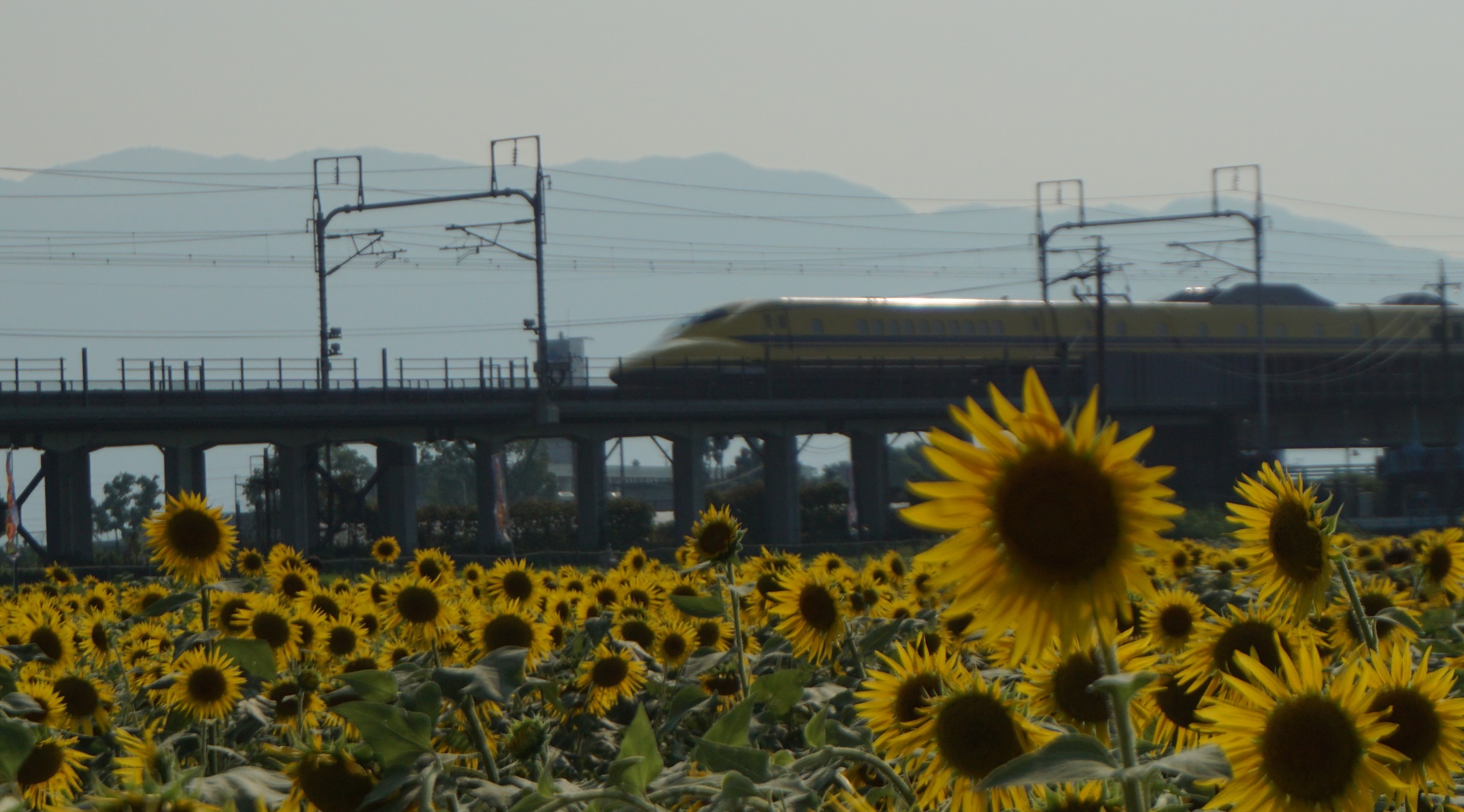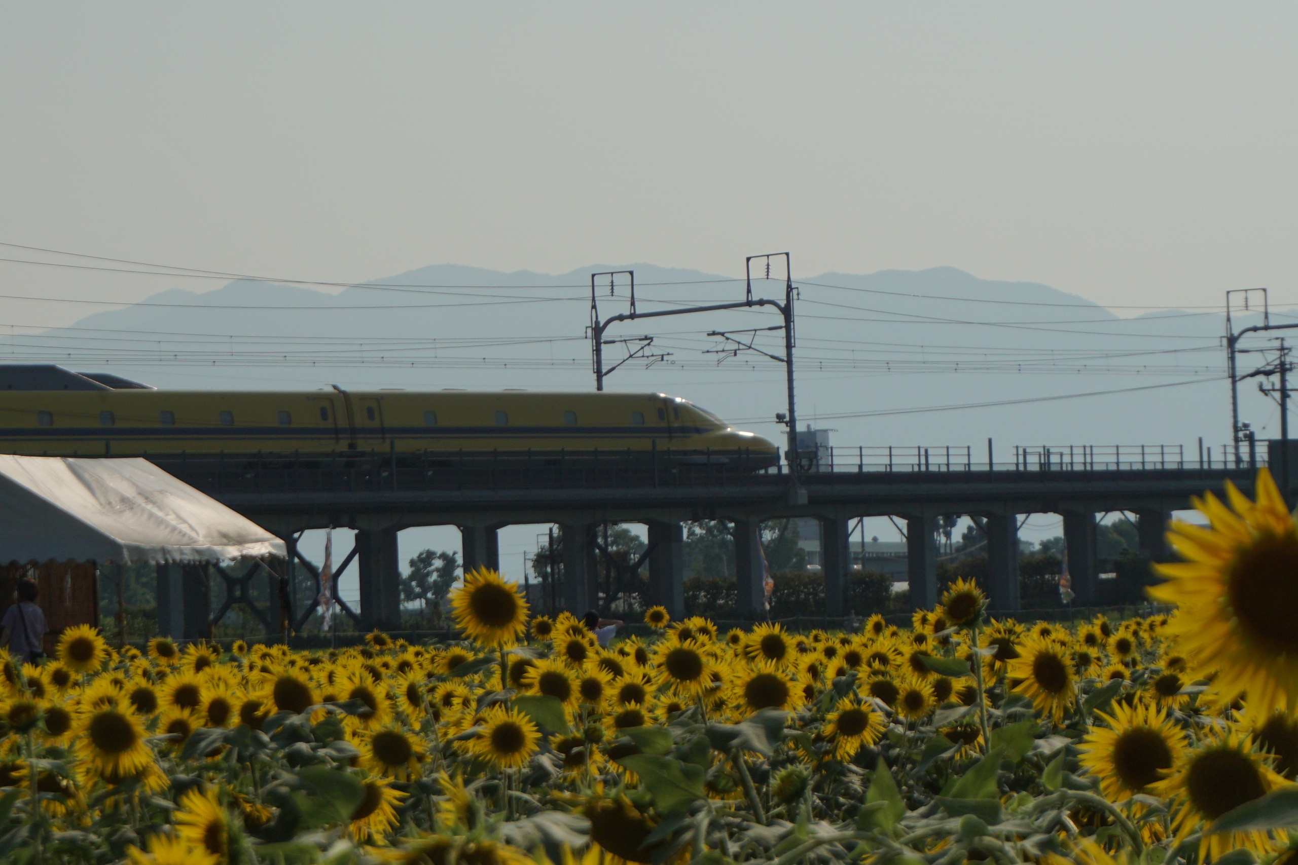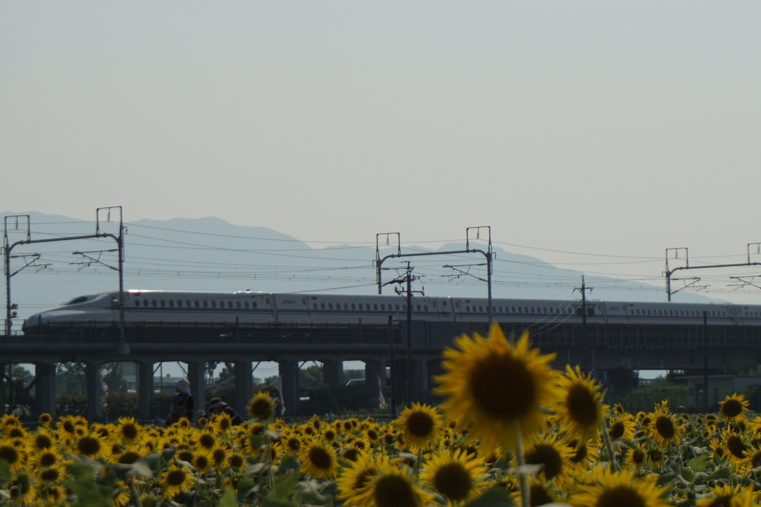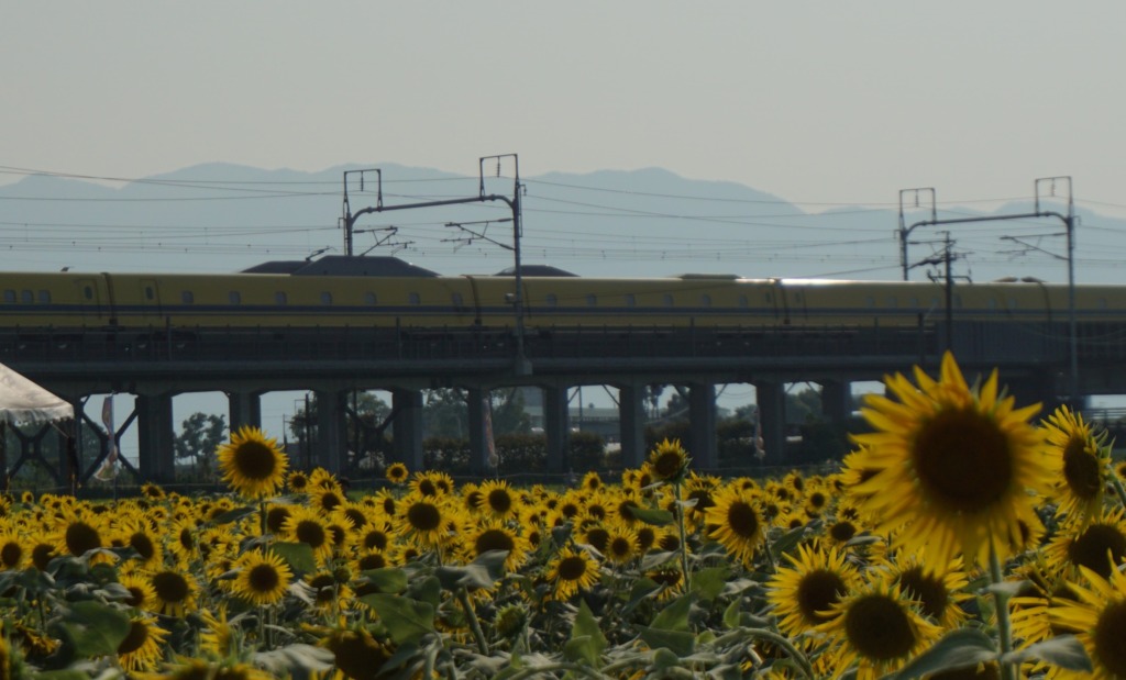 ヒマワリもそろそろ下を向き始めひまわり畑からドクターイエローを撮るのは今年はこれが最後になるんだって。一時間半も前に着いたのに畑の周りには三脚を構えた人でびっしり!思うように歩けやしないんだ。場所の取り合いでもめ事もあったらしくて、パトカーまで二台来てたんだって。