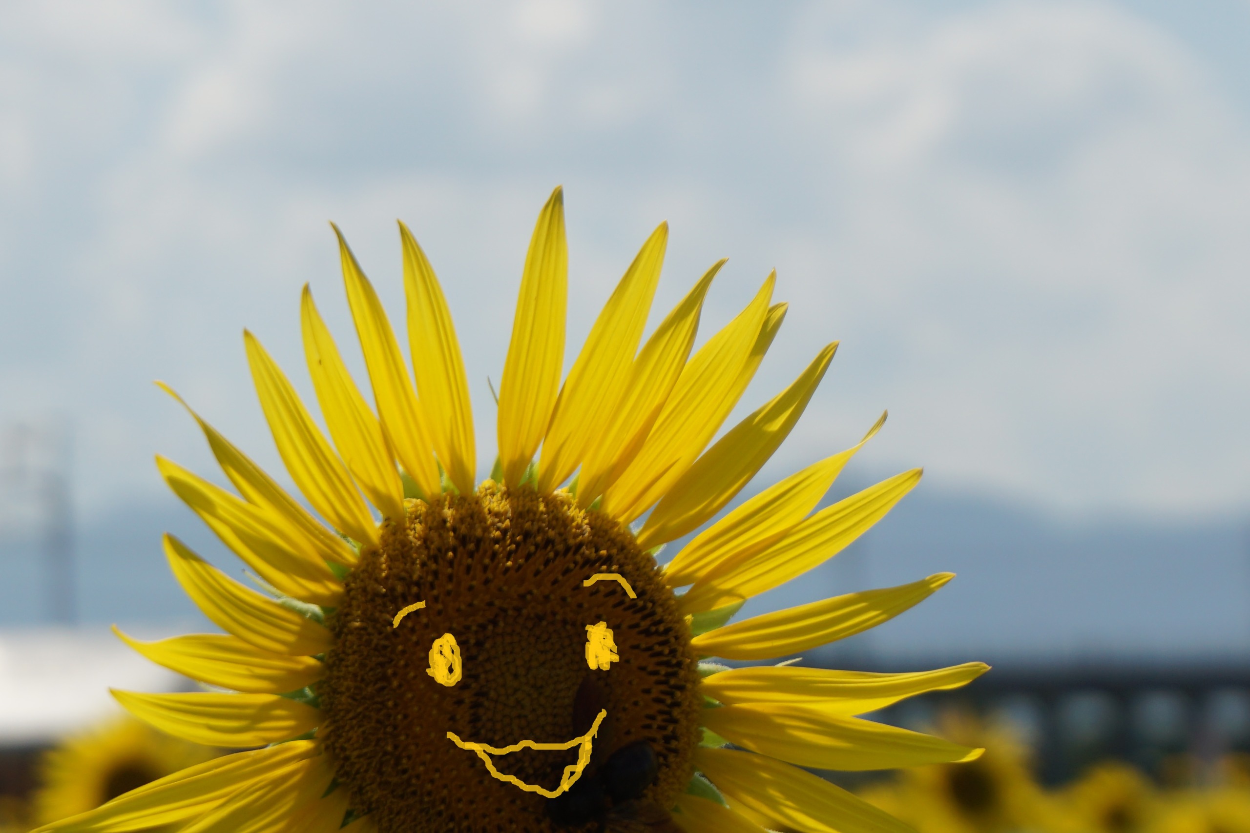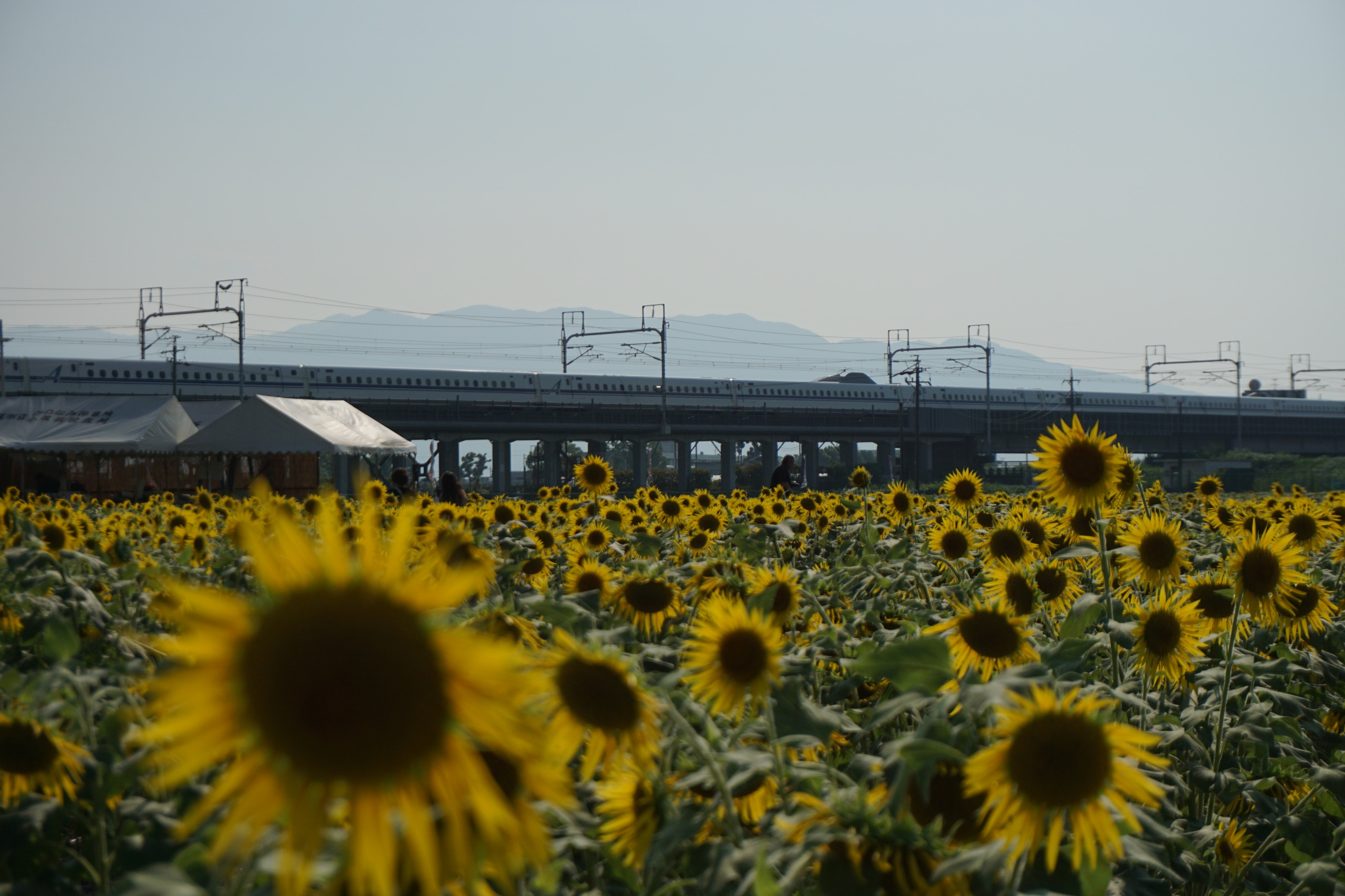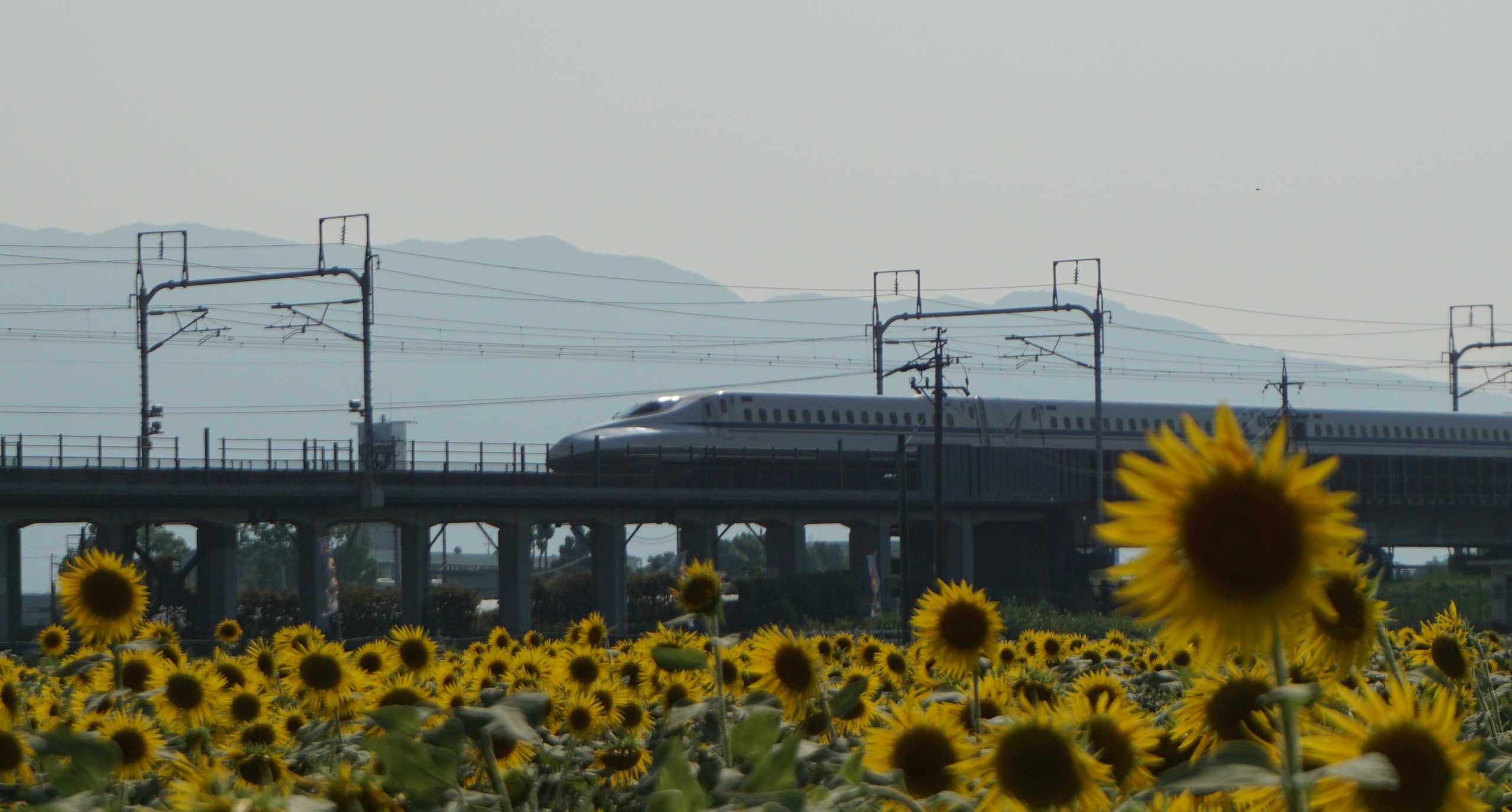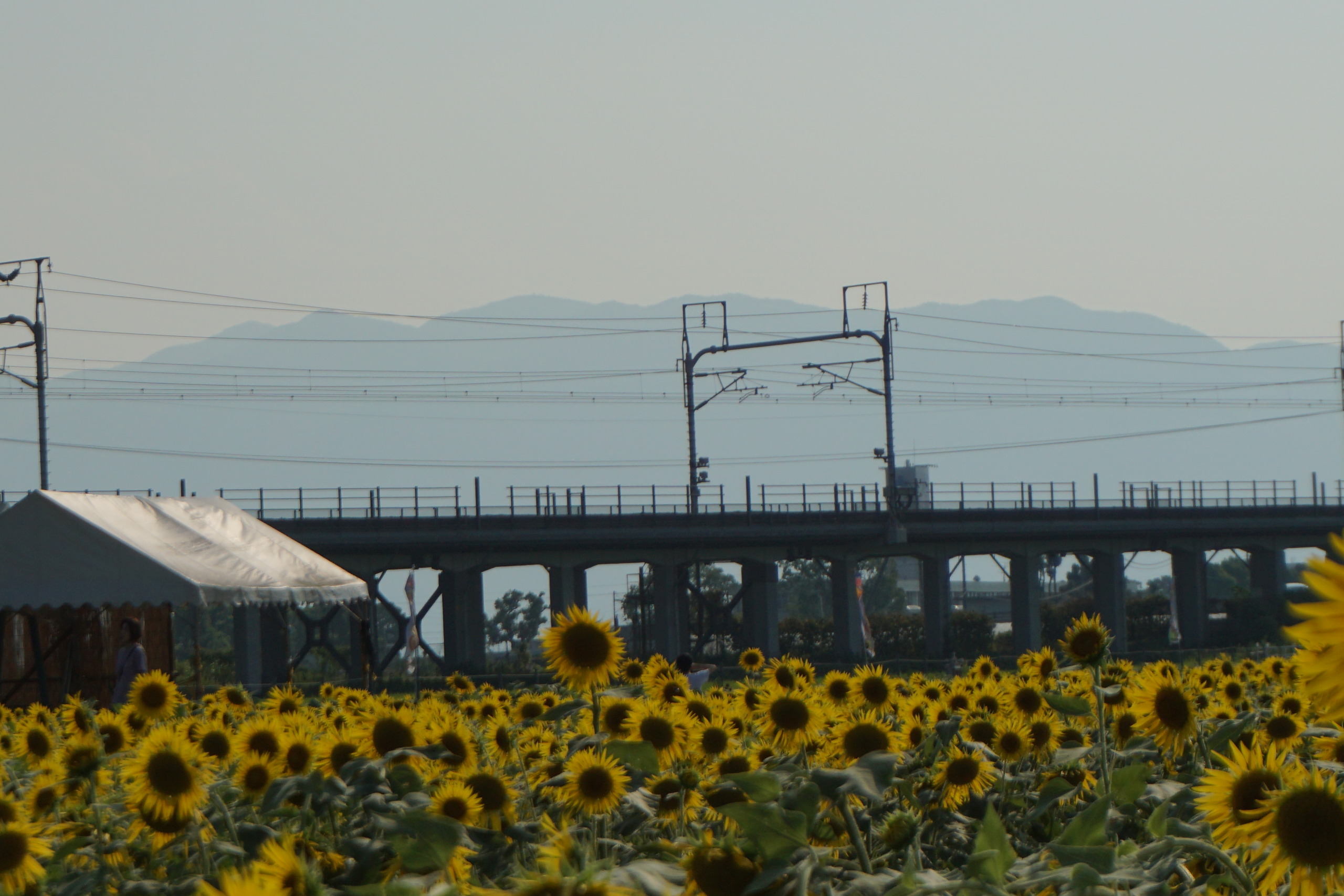 ヒマワリもそろそろ下を向き始めひまわり畑からドクターイエローを撮るのは今年はこれが最後になるんだって。一時間半も前に着いたのに畑の周りには三脚を構えた人でびっしり!思うように歩けやしないんだ。場所の取り合いでもめ事もあったらしくて、パトカーまで二台来てたんだって。
