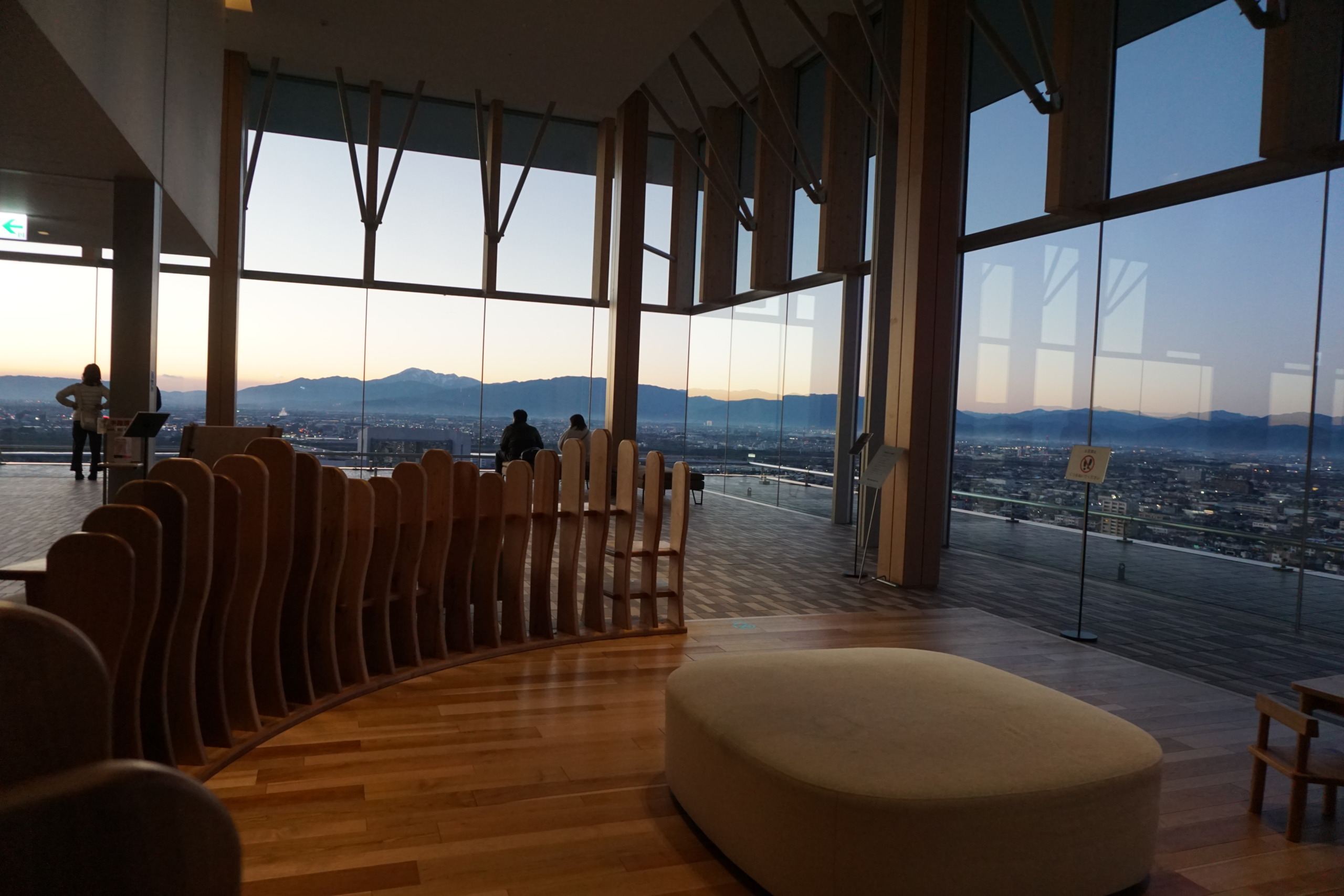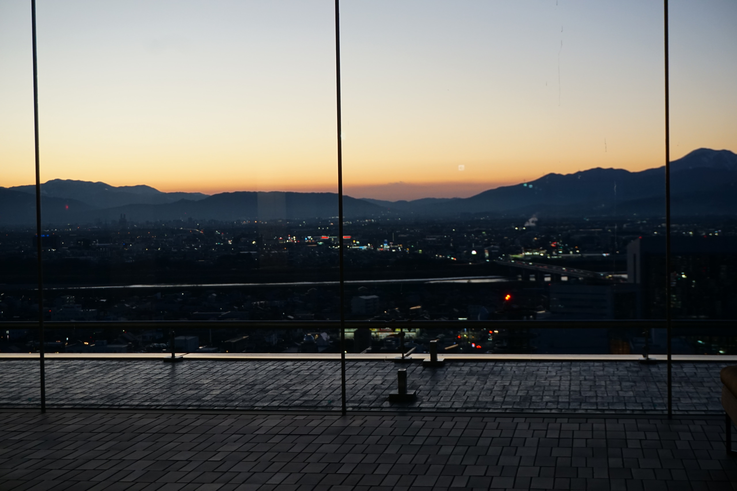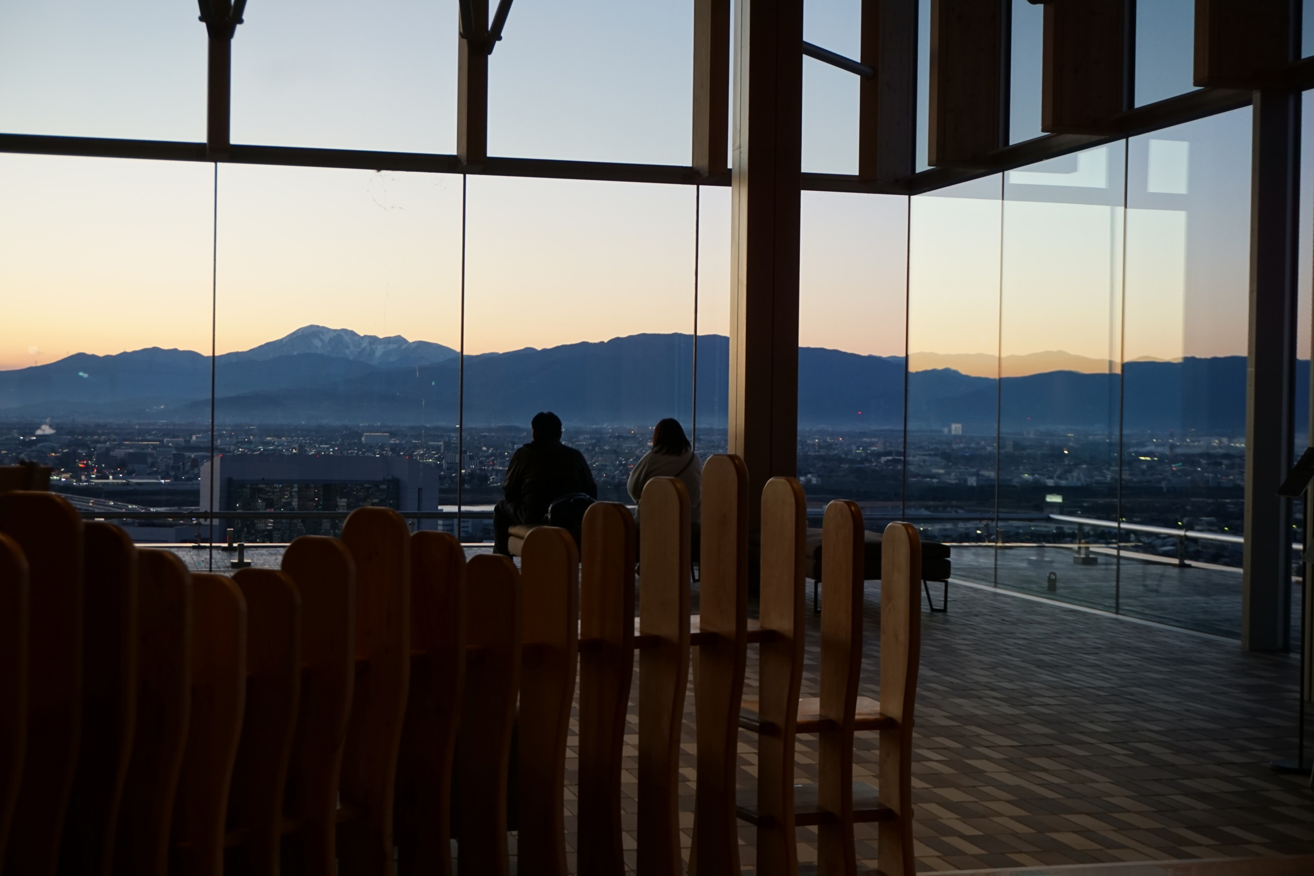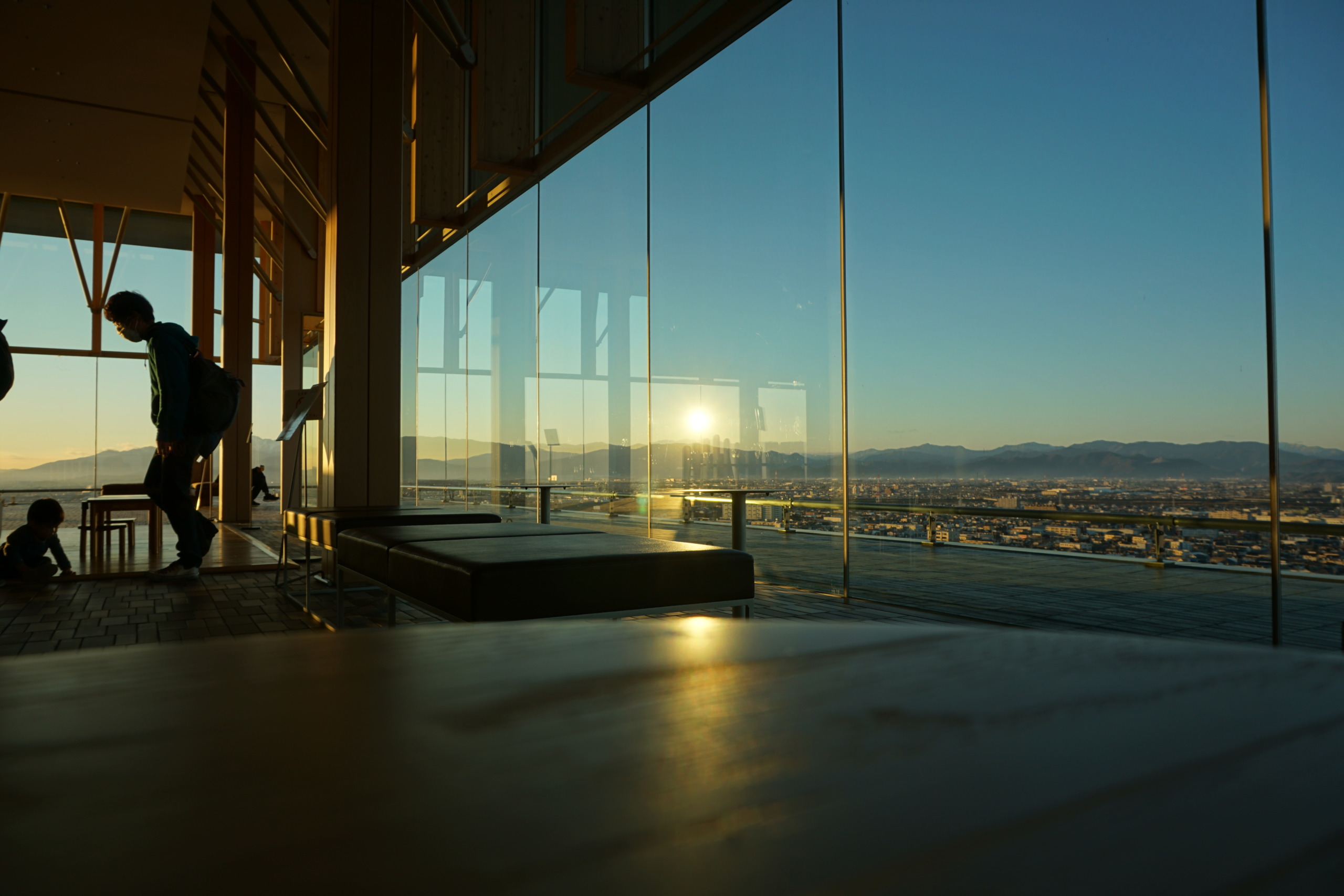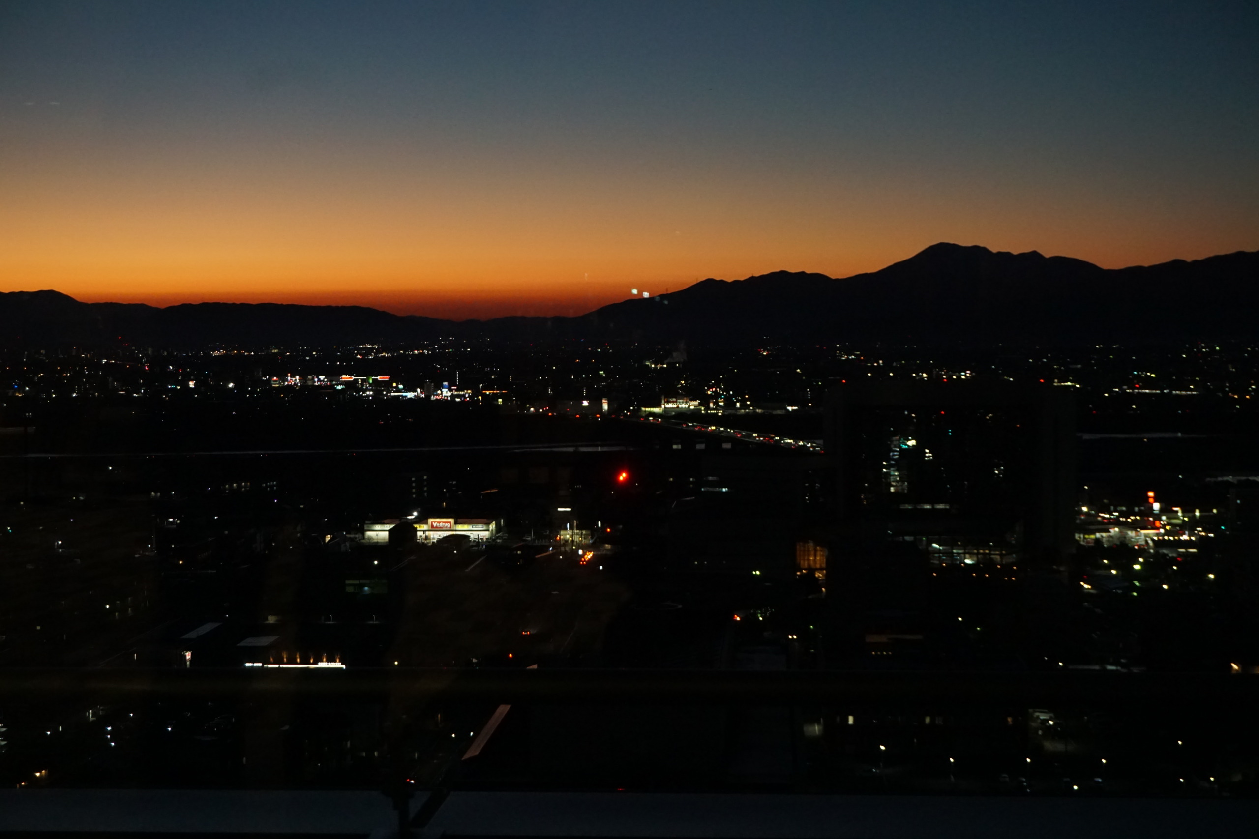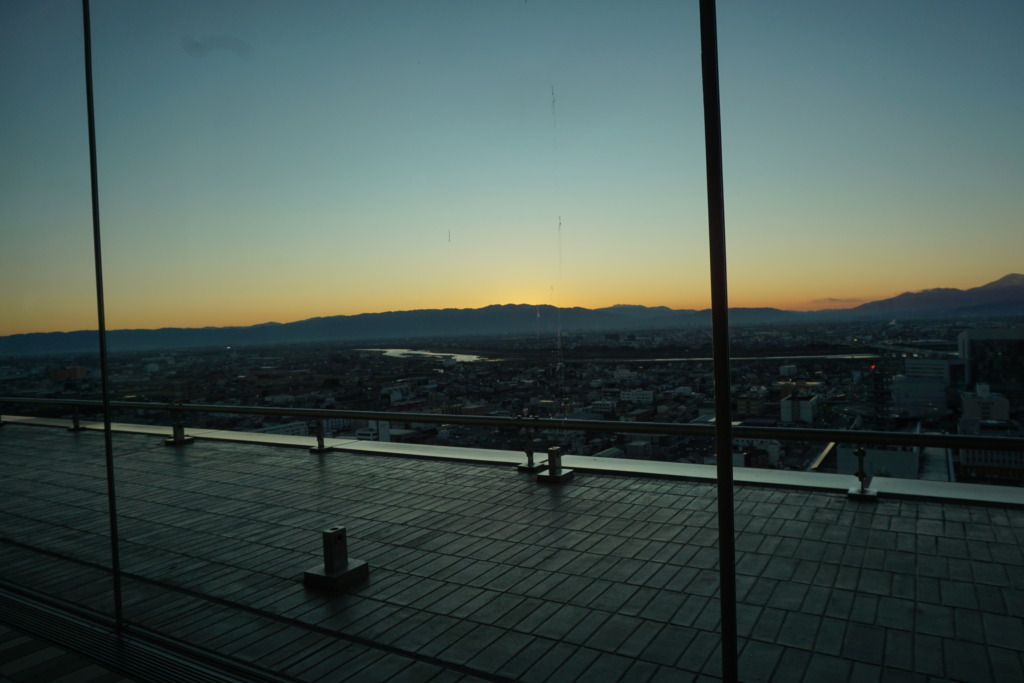 入口に入るとまだ2023年2月に建てられたとあってピカピカなのが余計寒々と感じさせ、警備員さんが一人なのも広々とした空間に不釣り合いに思えた。20階展望台へやまんばはおじさんとエレベーターに乗った。なんと展望台は地上90mなんだって! さあ! エレベーターのドアが開くと広々としたロビーにいくつもソファが並べられくつろぎの空間が広がっていた。最高‼ カメラやスマホを手にした人がチラホラし始めていた。やまんばも夜景を撮るにはまだまだ時間がかかりそうで沈む夕陽にだんだんと紅色に染められていく空をカメラに収めた。