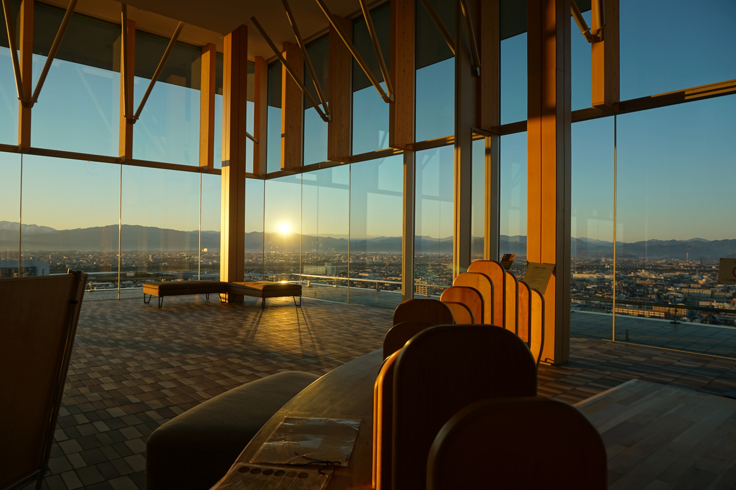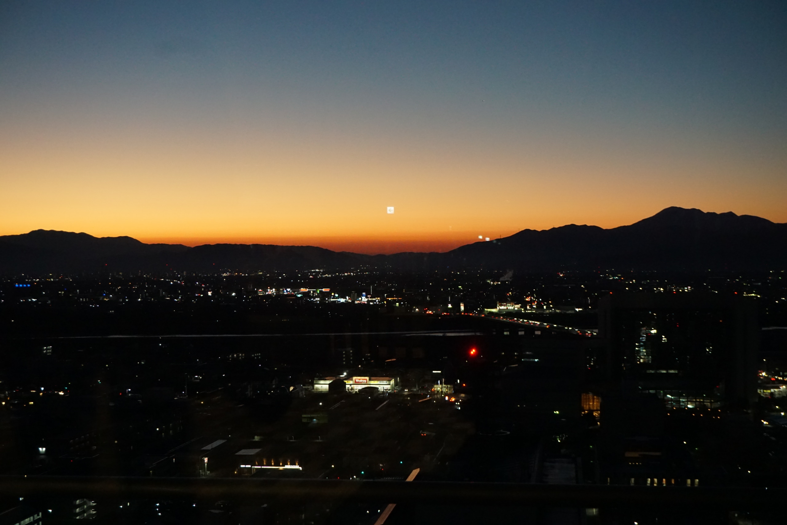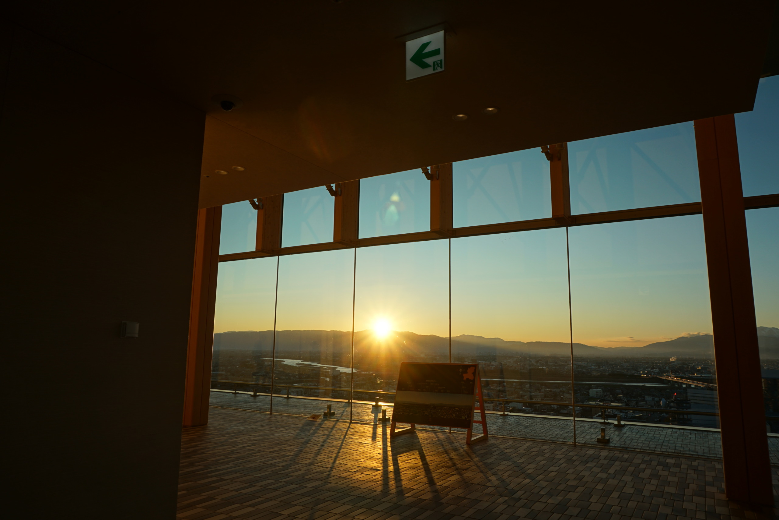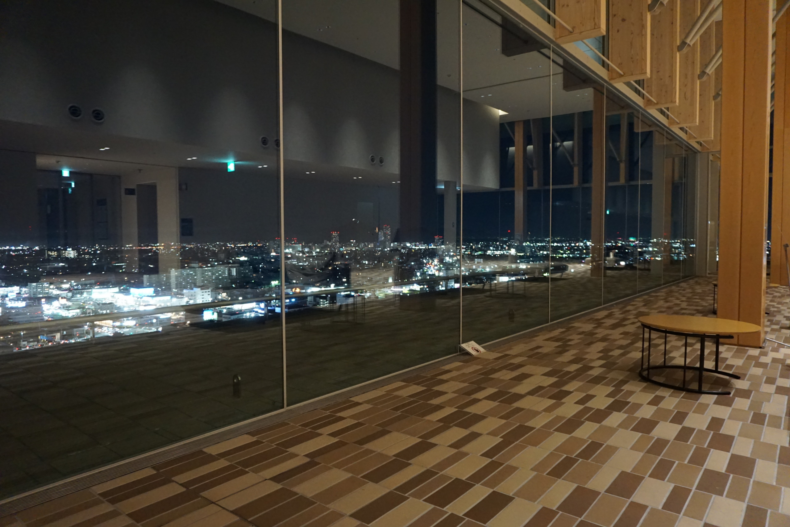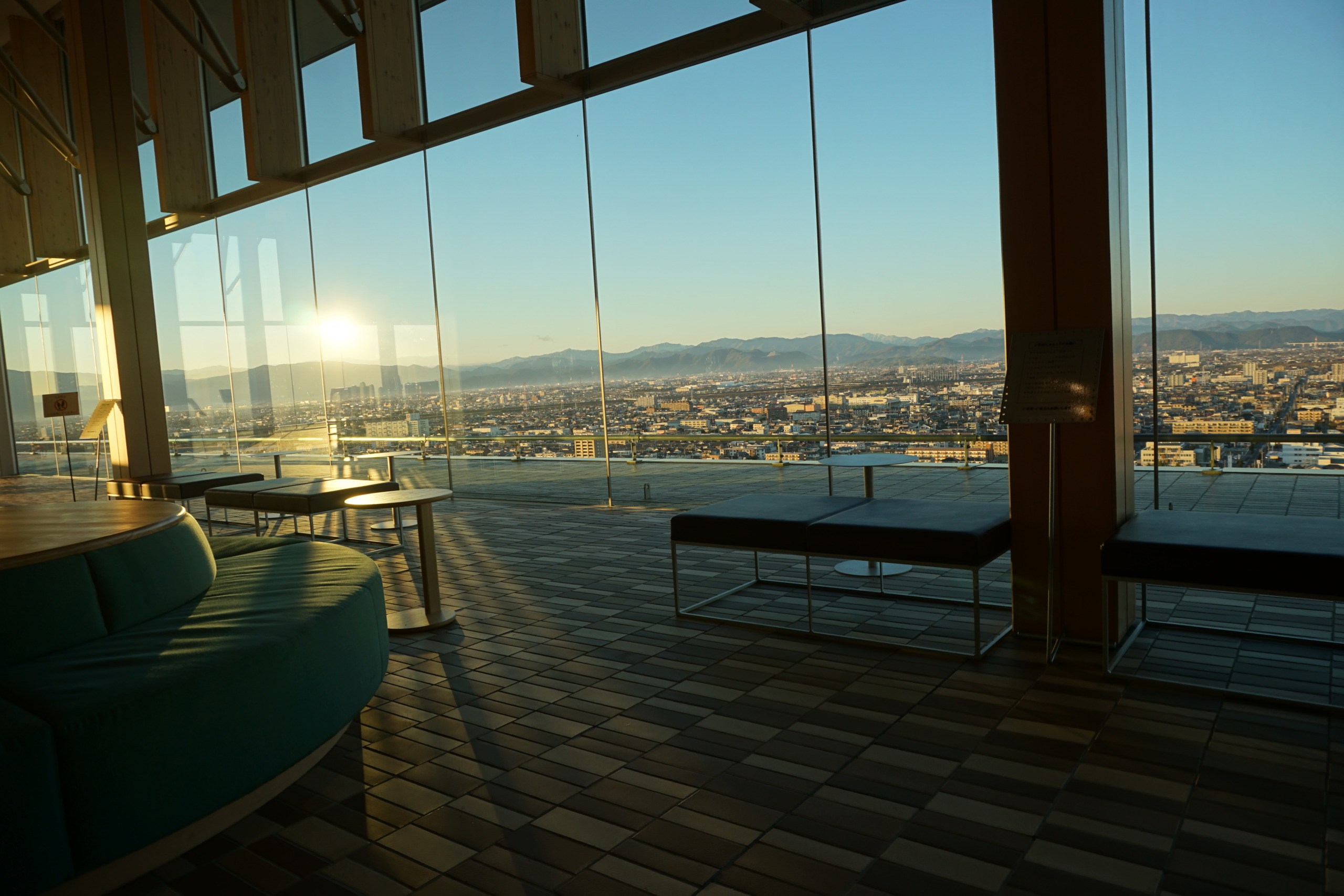 入口に入るとまだ2023年2月に建てられたとあってピカピカなのが余計寒々と感じさせ、警備員さんが一人なのも広々とした空間に不釣り合いに思えた。20階展望台へやまんばはおじさんとエレベーターに乗った。なんと展望台は地上90mなんだって! さあ! エレベーターのドアが開くと広々としたロビーにいくつもソファが並べられくつろぎの空間が広がっていた。最高‼ カメラやスマホを手にした人がチラホラし始めていた。やまんばも夜景を撮るにはまだまだ時間がかかりそうで沈む夕陽にだんだんと紅色に染められていく空をカメラに収めた。