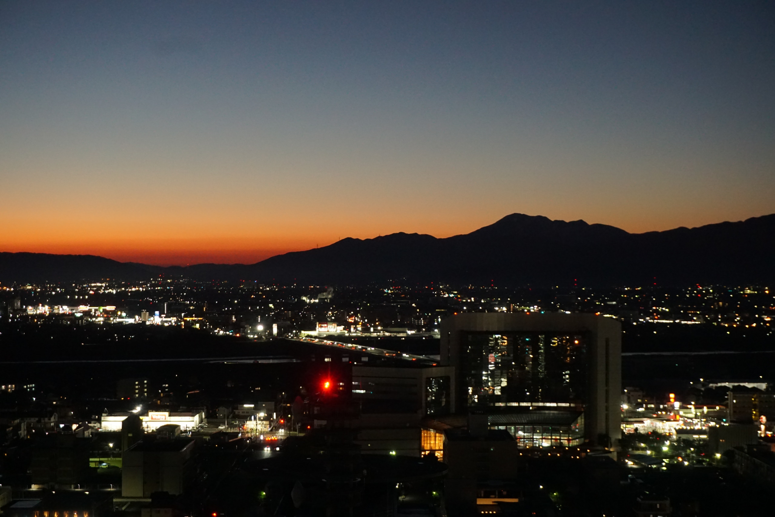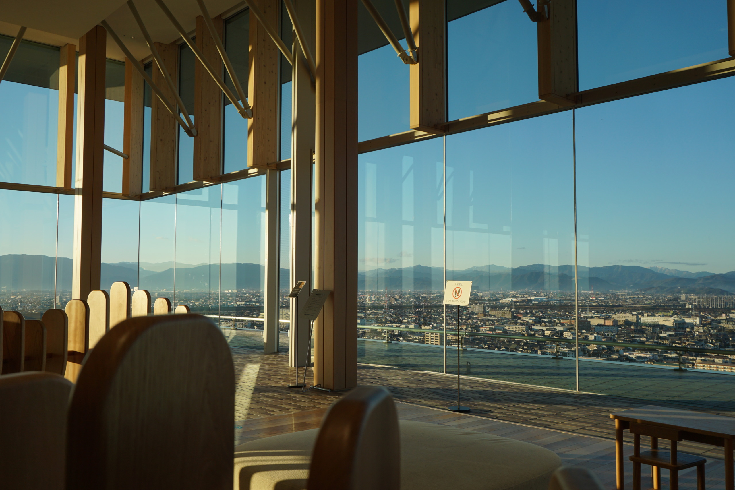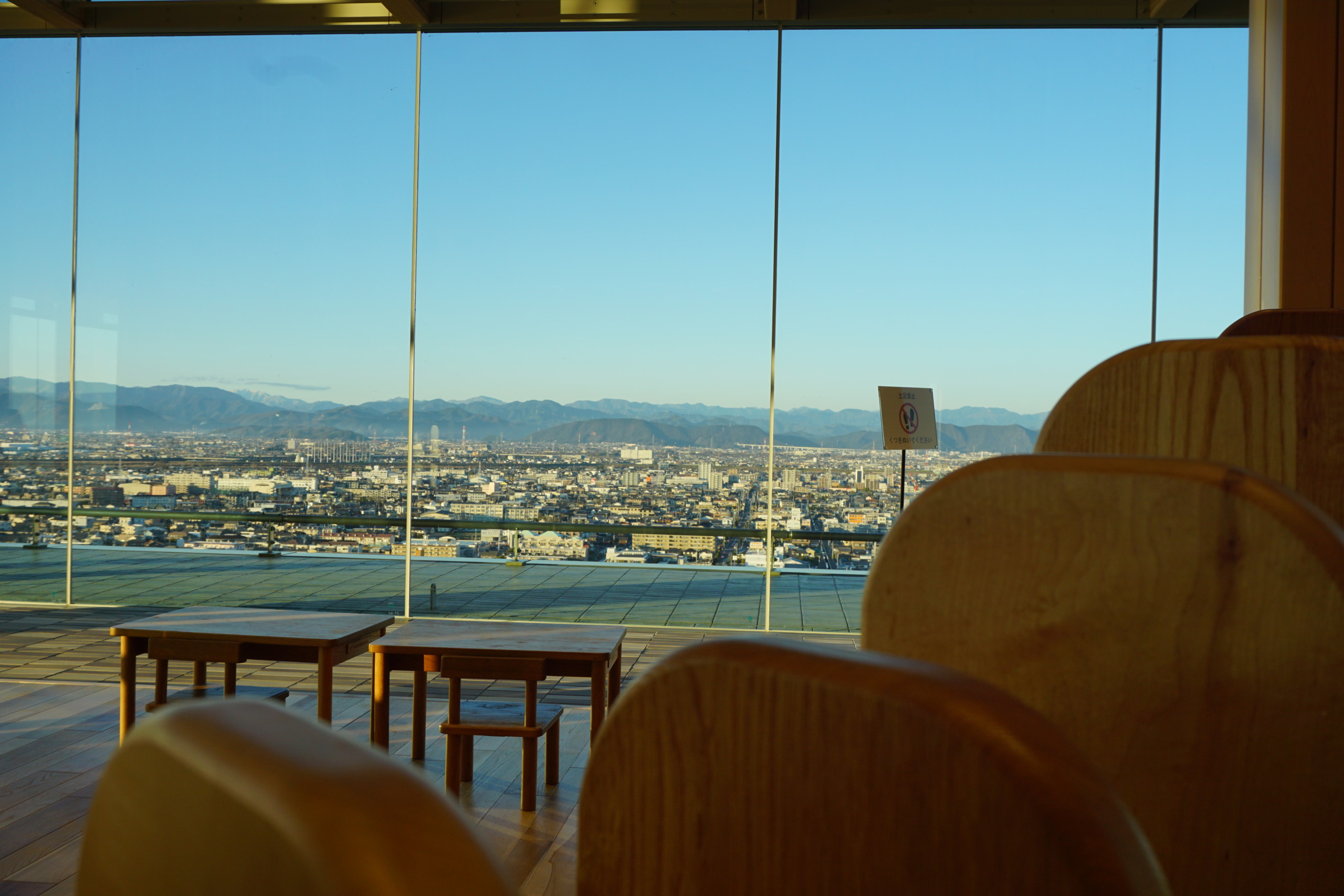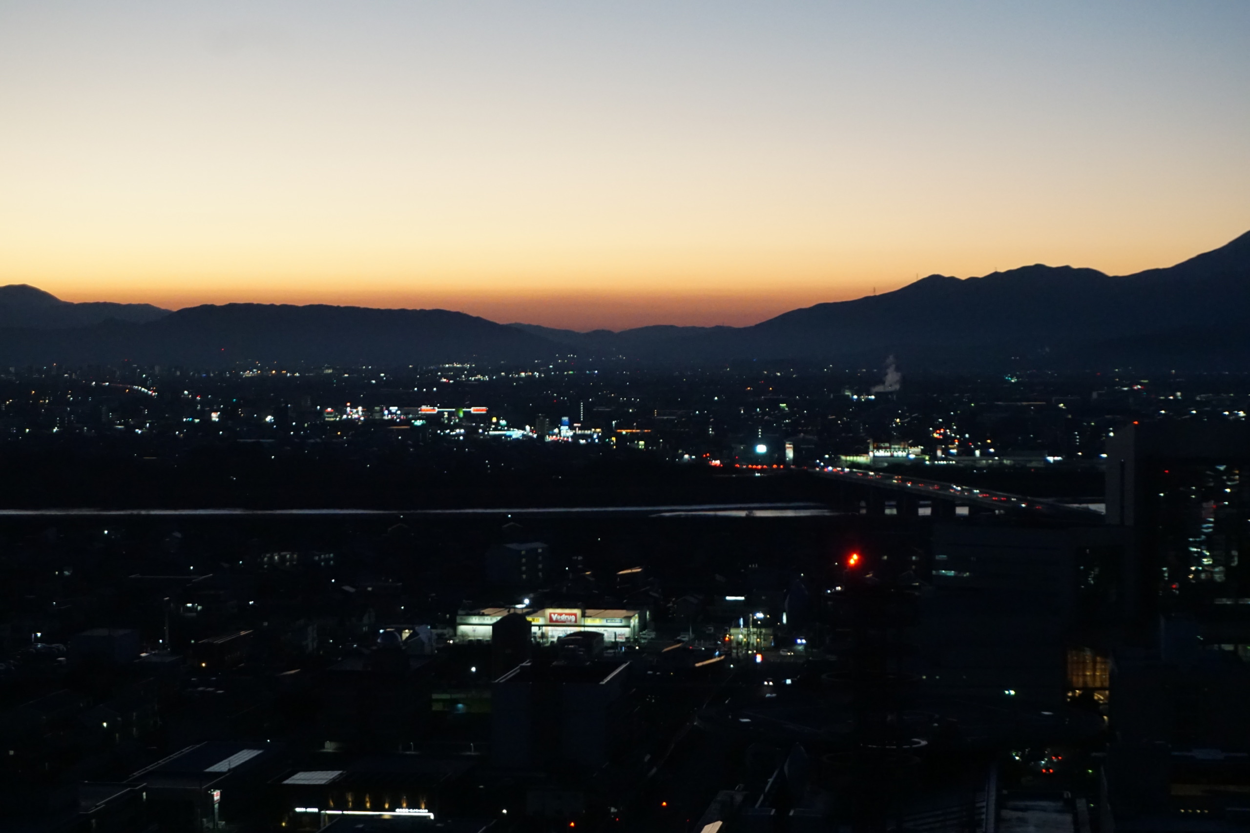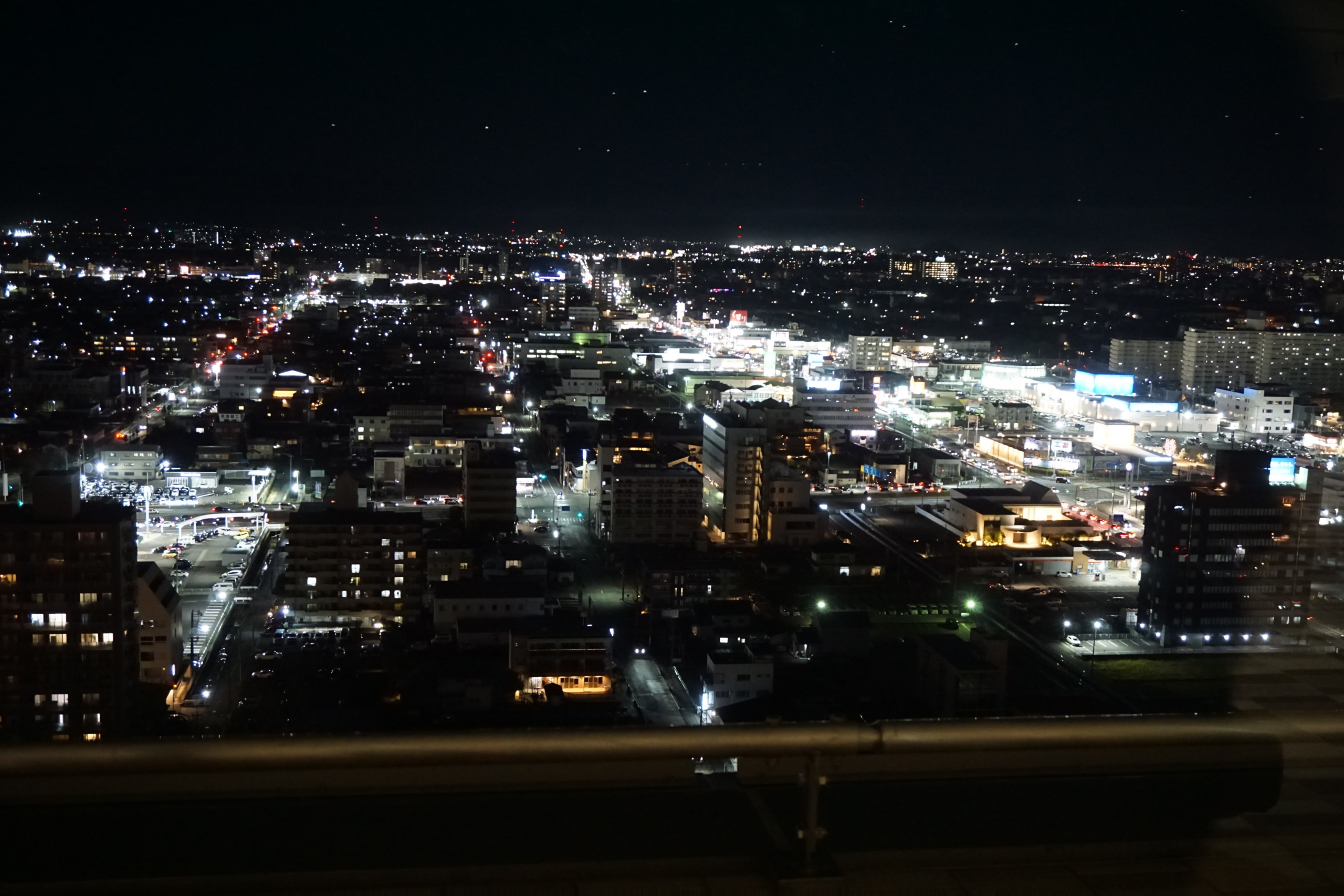 入口に入るとまだ2023年2月に建てられたとあってピカピカなのが余計寒々と感じさせ、警備員さんが一人なのも広々とした空間に不釣り合いに思えた。20階展望台へやまんばはおじさんとエレベーターに乗った。なんと展望台は地上90mなんだって! さあ! エレベーターのドアが開くと広々としたロビーにいくつもソファが並べられくつろぎの空間が広がっていた。最高‼ カメラやスマホを手にした人がチラホラし始めていた。やまんばも夜景を撮るにはまだまだ時間がかかりそうで沈む夕陽にだんだんと紅色に染められていく空をカメラに収めた。