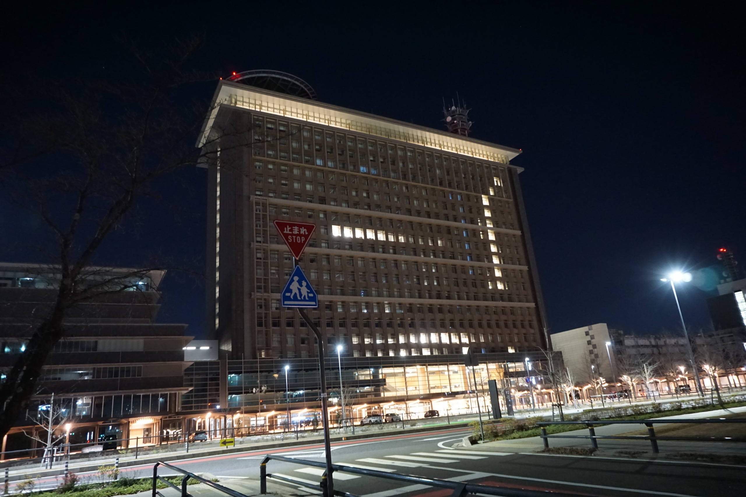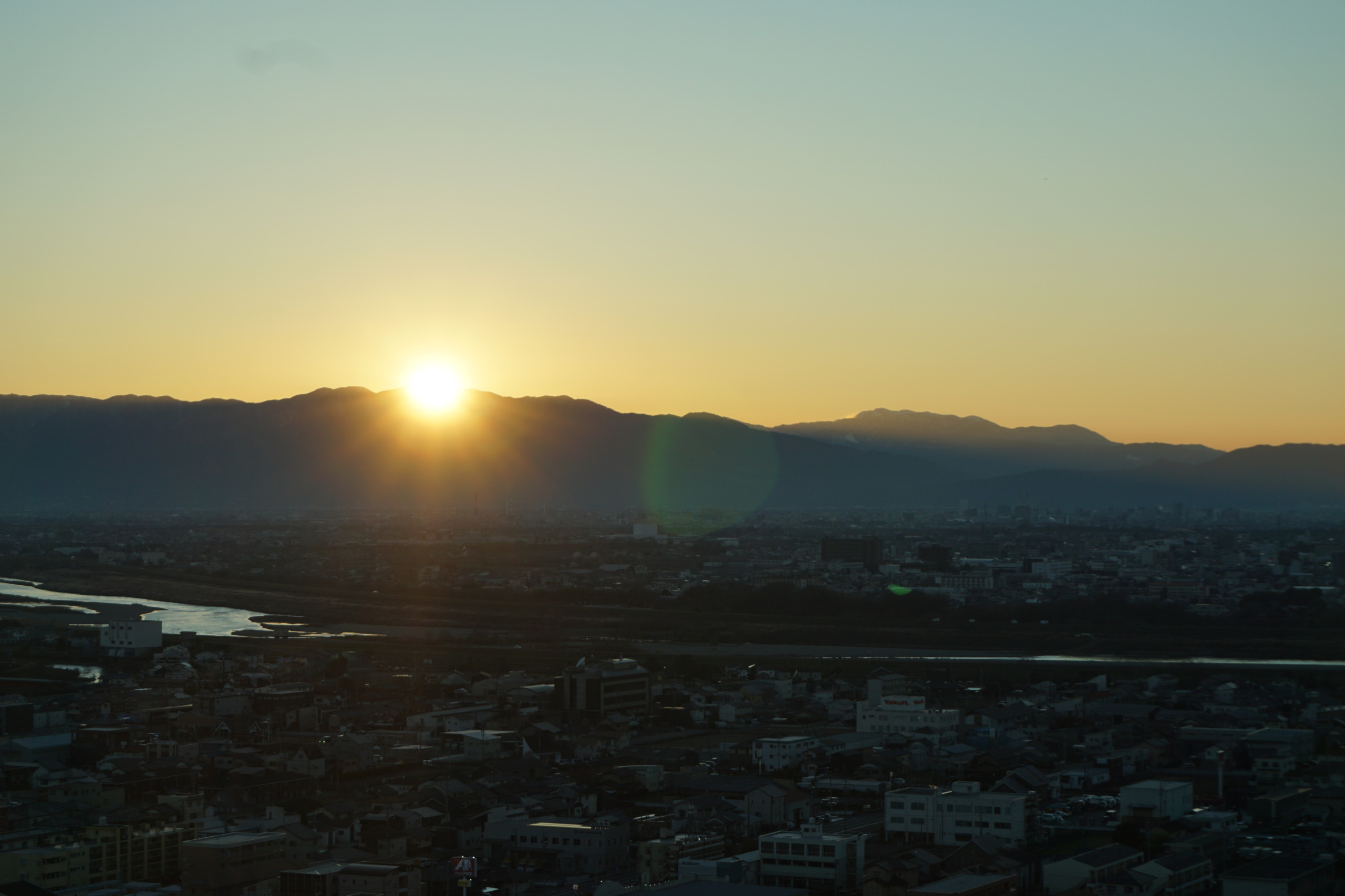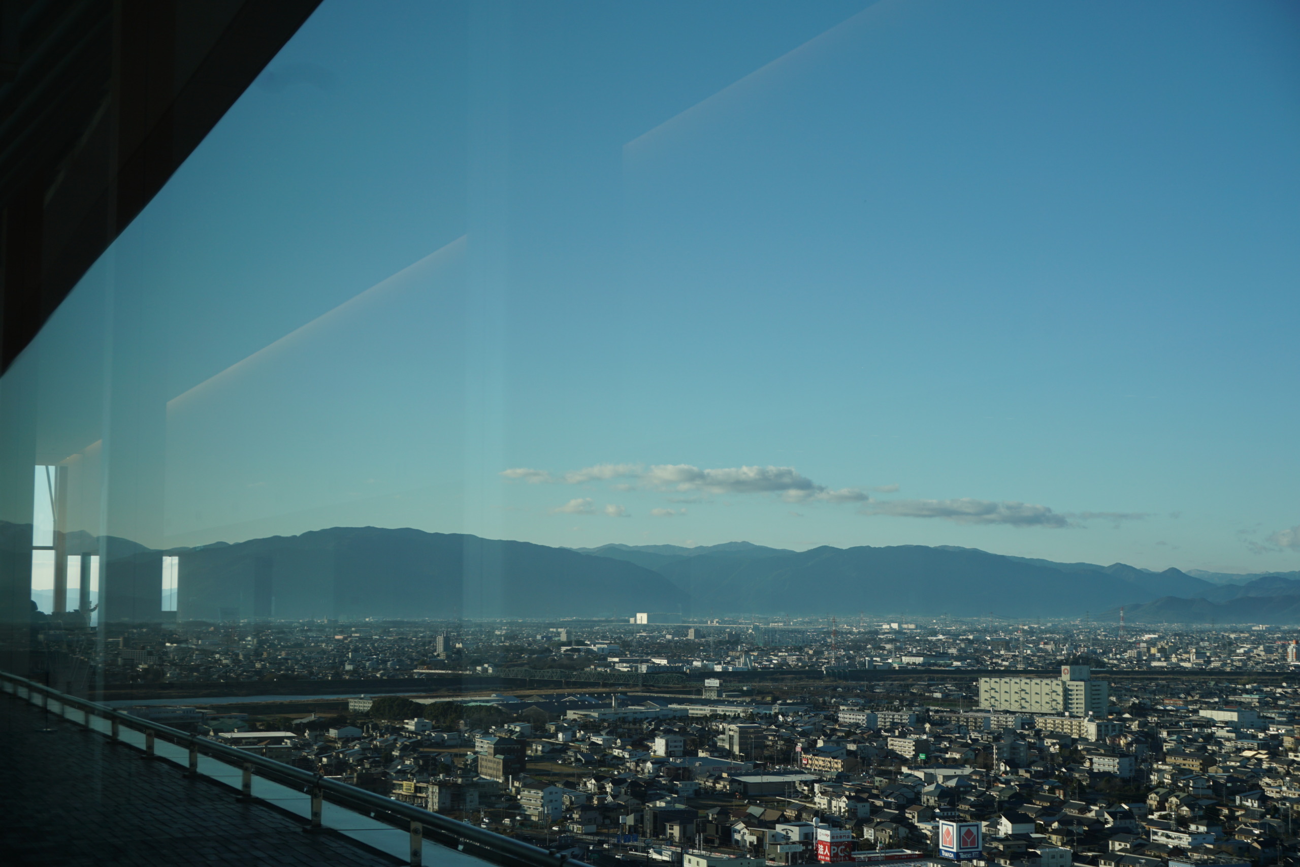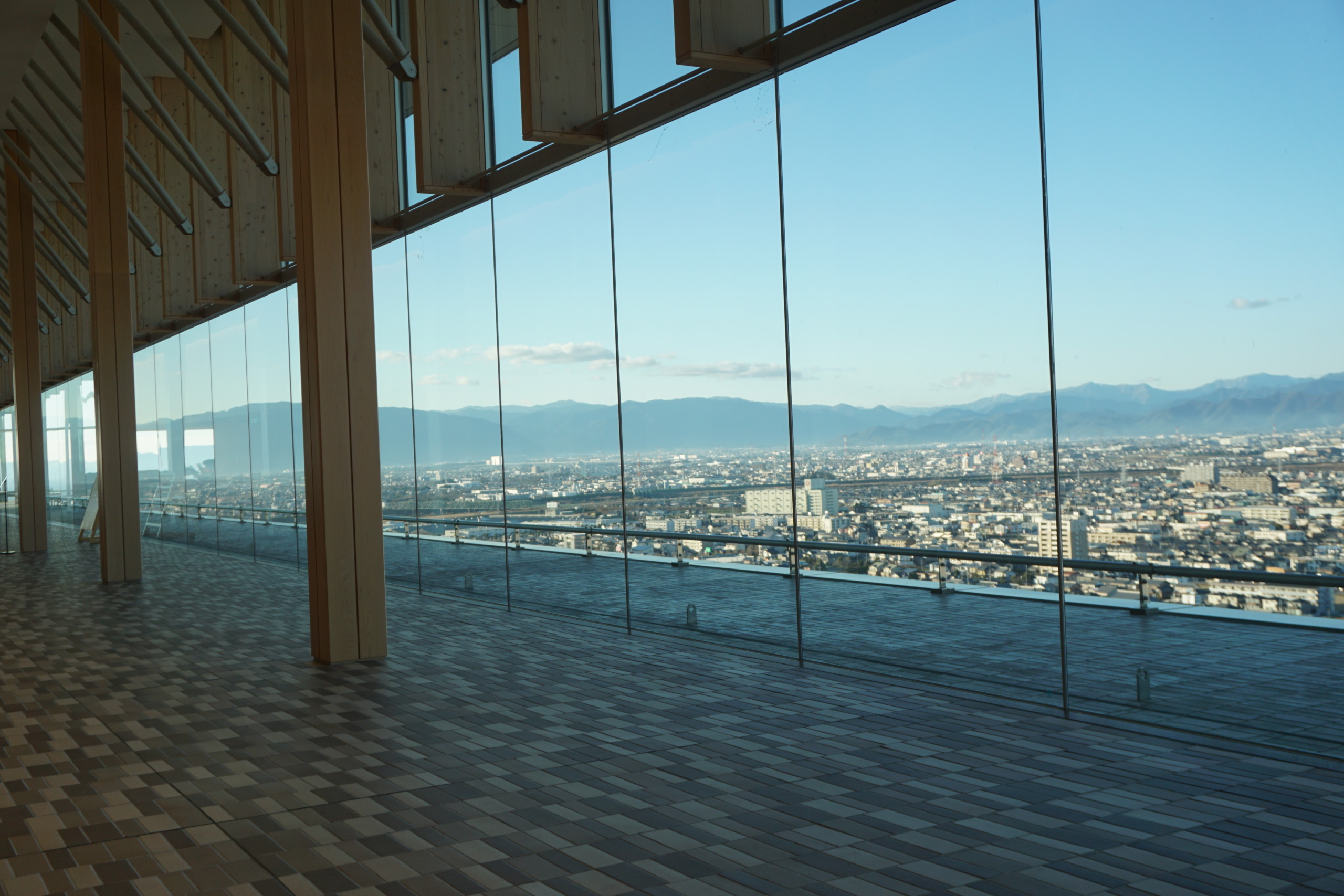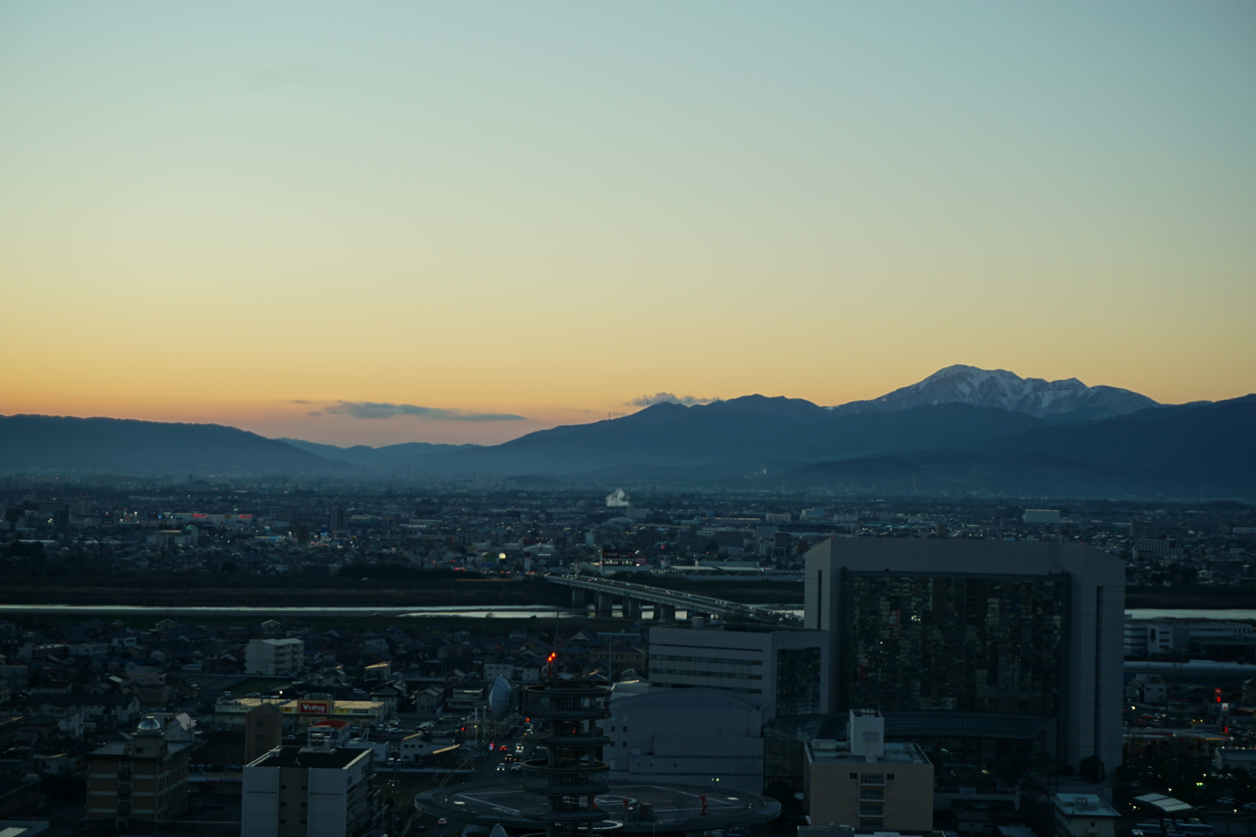 入口に入るとまだ2023年2月に建てられたとあってピカピカなのが余計寒々と感じさせ、警備員さんが一人なのも広々とした空間に不釣り合いに思えた。20階展望台へやまんばはおじさんとエレベーターに乗った。なんと展望台は地上90mなんだって! さあ! エレベーターのドアが開くと広々としたロビーにいくつもソファが並べられくつろぎの空間が広がっていた。最高‼ カメラやスマホを手にした人がチラホラし始めていた。やまんばも夜景を撮るにはまだまだ時間がかかりそうで沈む夕陽にだんだんと紅色に染められていく空をカメラに収めた。