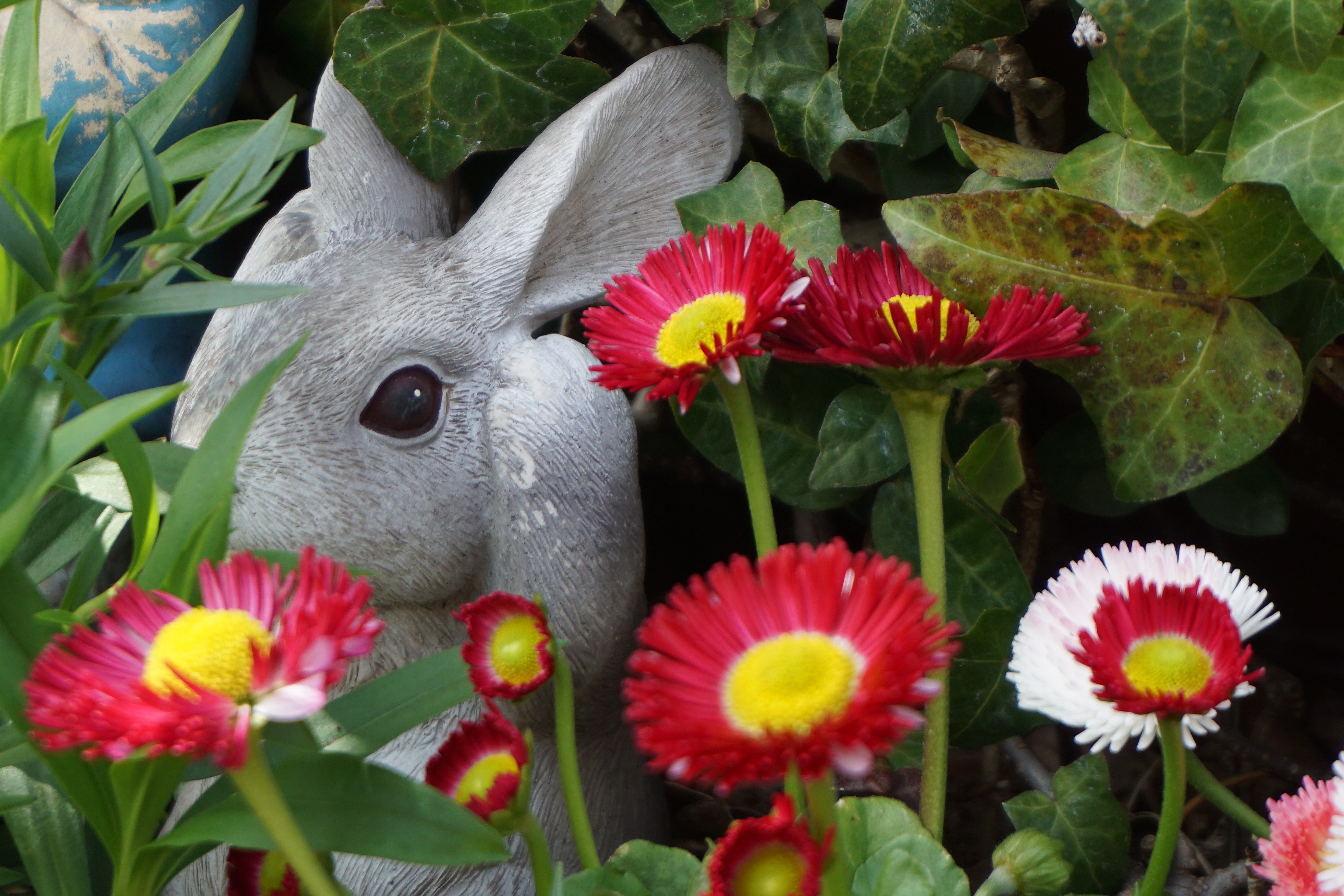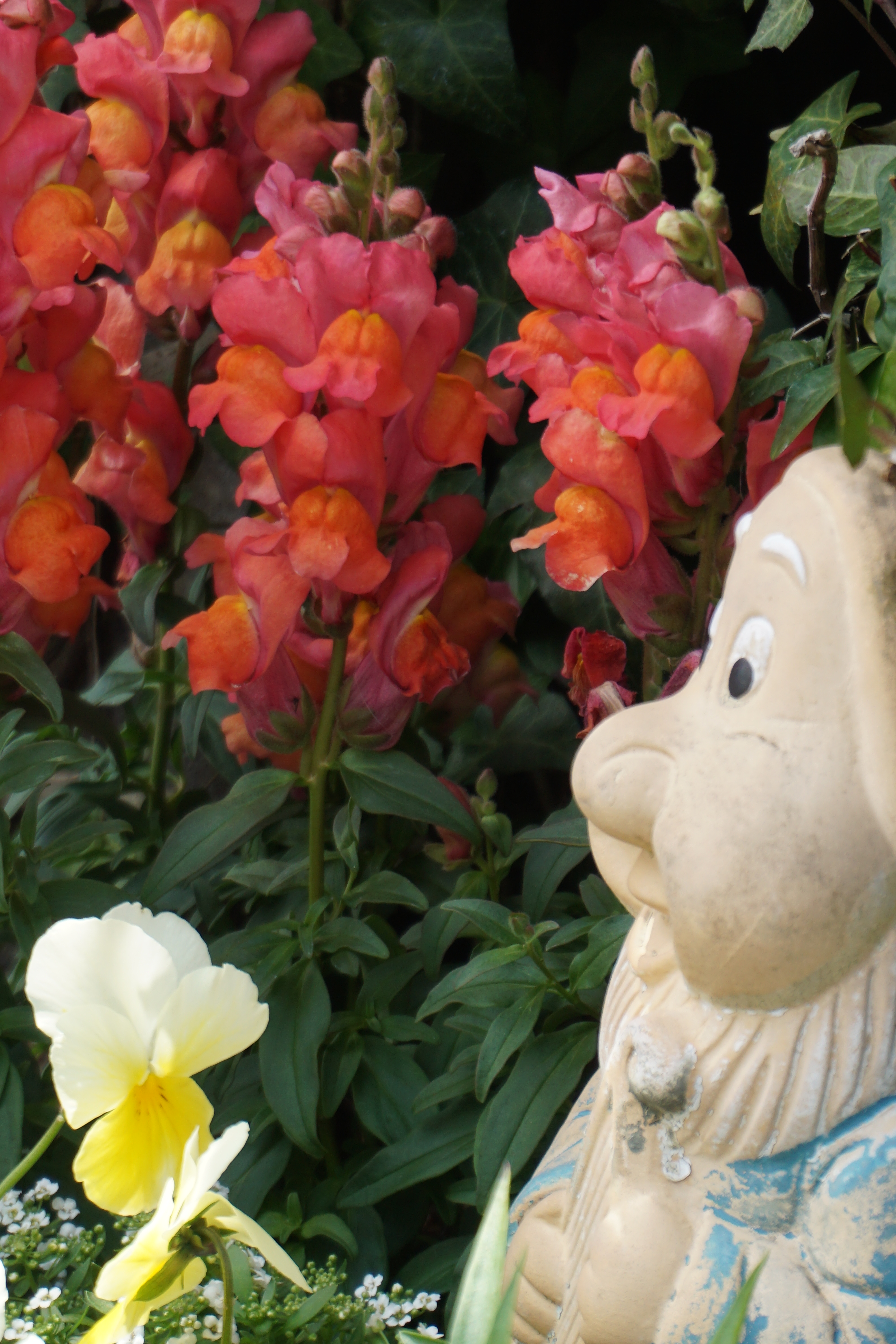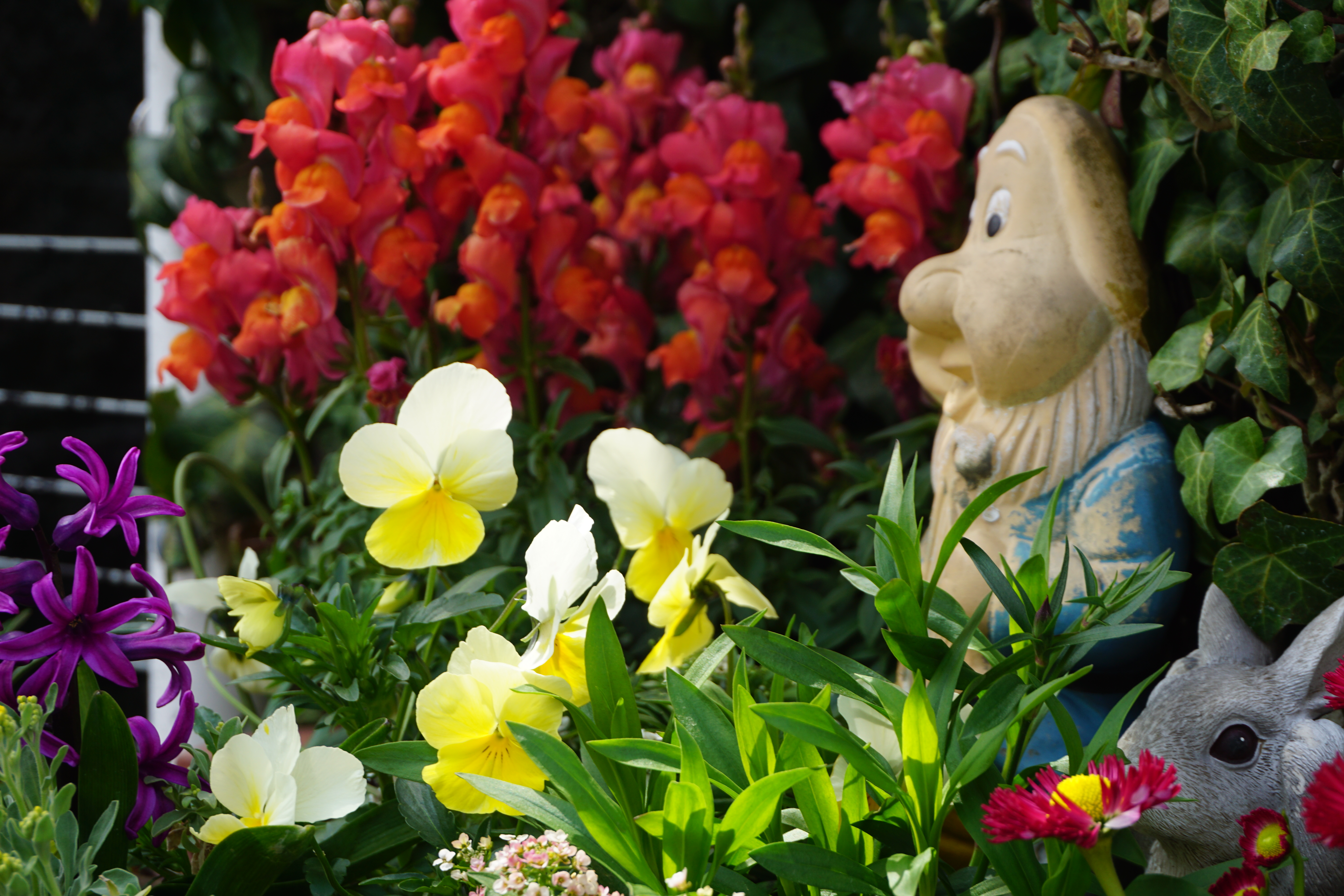 先ずはやまんばが大好きで毎年欠かせないジュリアンさんを農協で買って来た。次にデージーさん、それから昨年は暑すぎてチューリップさんが球根不足で手に入らなかったものだから代わりに金魚草を買って来たんだ。最後にすき間をアリッサムさんに飾ってもらって完成だよ。見てねー!・・・  そうそう売れ残って退屈そうにしていた可愛いビオラさんも仲間入りしたよ!