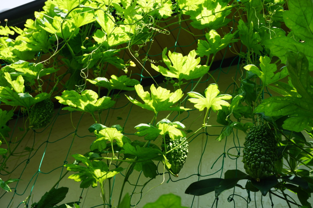 2025年8月31日(日) やまんばの家庭菜園で希望の星、ゴーヤ君は五個収穫してもまだほら!こんなにぶら下がっているんだよ。ゴーヤ君のプランターの前にはキンモクセイとモチの木があったし五メートル先には前の家があったのが良かったかもしれない...